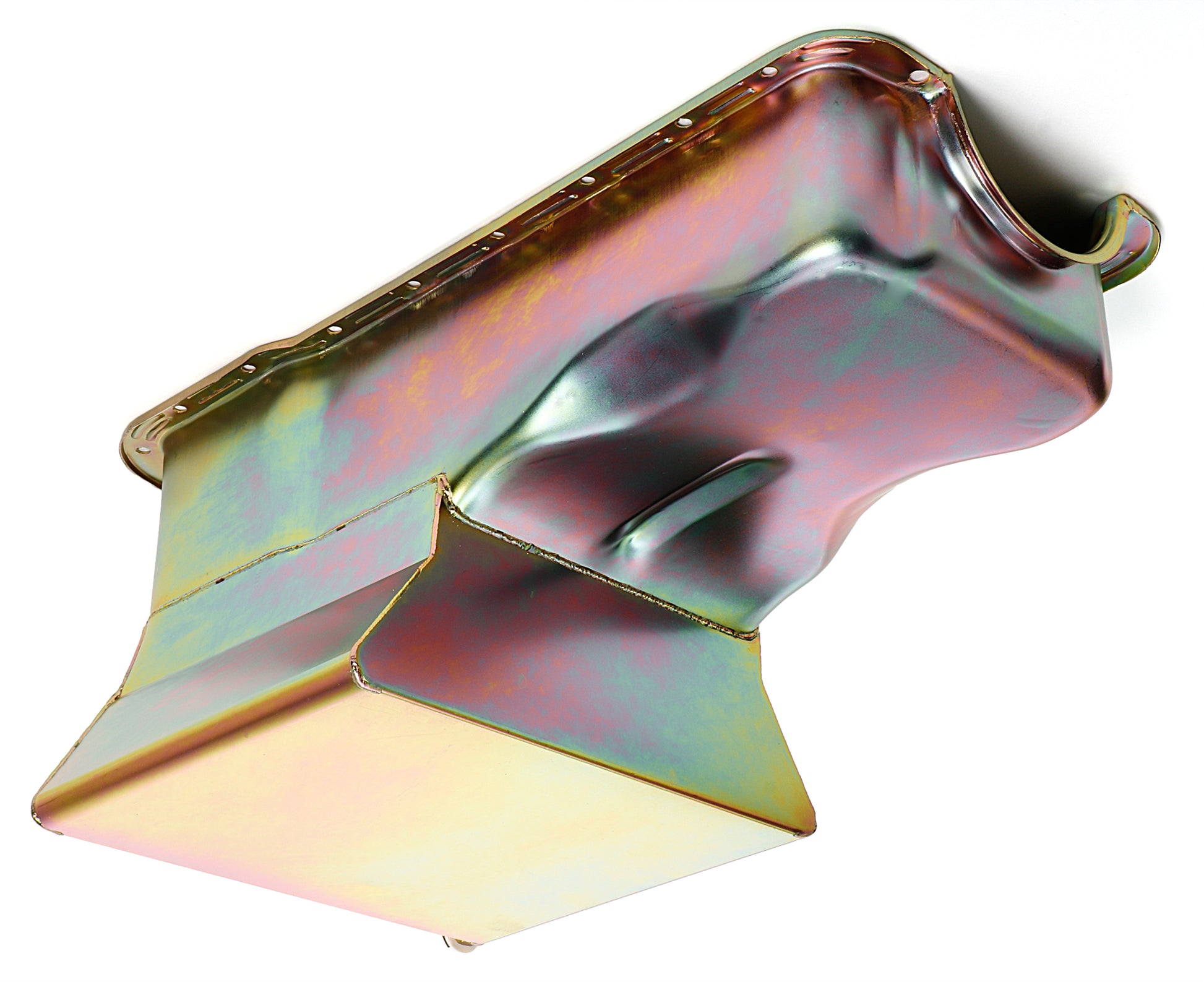 This Trans-Dapt Performance Street and Strip oil pan is an ideal entry-level performance oil pan, and fits 1965-87 SB Ford (260-302W) engines in most Ford passenger vehicles and 2WD trucks that use a front sump oil pan. The pan measures 9" deep and a 7 quart oil capacity. Its all-steel construction makes it strong, lightweight and affordably priced, while the tough Yellow Zinc finish protects it against corrosion. Gaskets, bolts and pick-up not included.