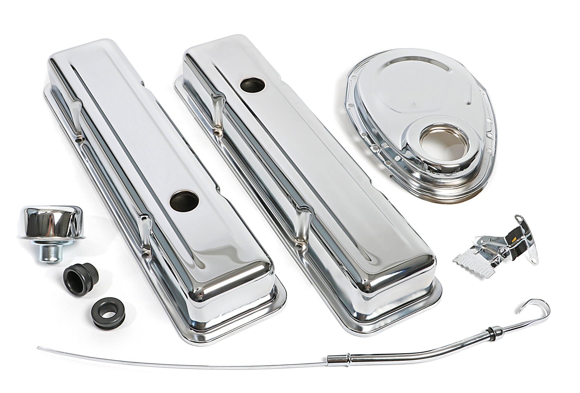 - Product Details: SB Chevy Front Cover Engine Dress Up Chrome Kit w/ Short Baffled valve covers