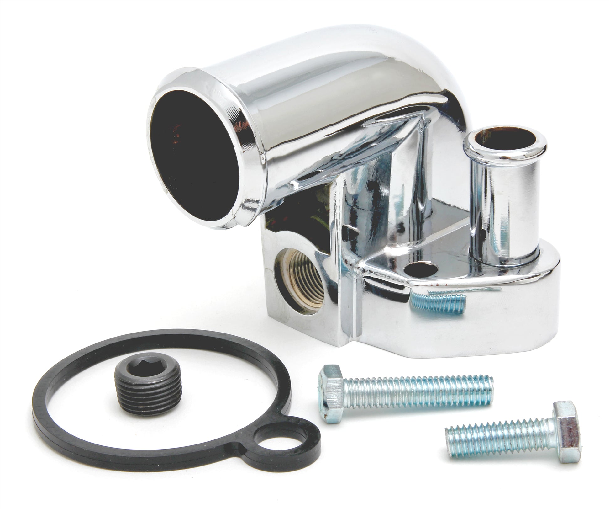- Package Contents: CHROME water neck (thermostat housing), gasket, mounting bolts