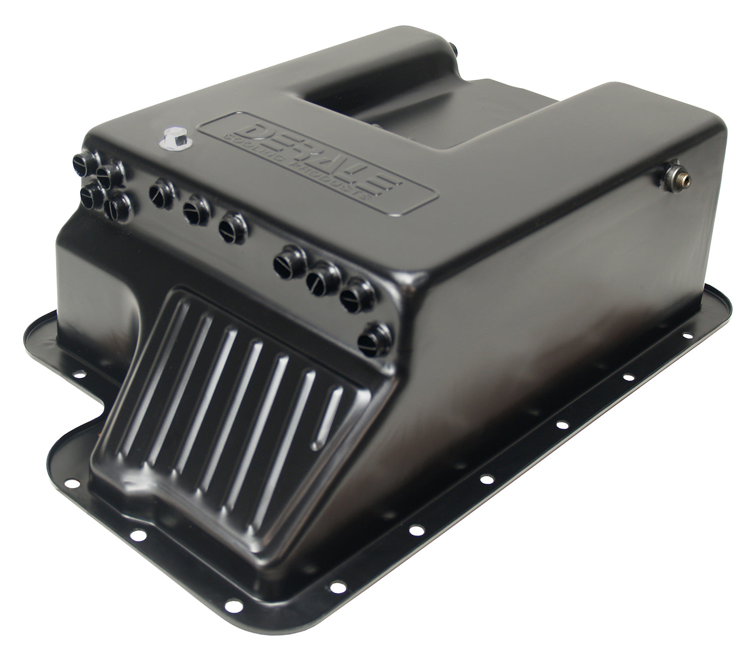 Derale's Transmission Cooling Pan #14208 uses air passing beneath the vehicle and redirects it to help lower transmission oil temperatures. Designed for Ford's E4OD, 4R100 and later 5R110 & 5R110W heavy duty transmissions, this pan features brazed, turbulator-equipped airway tubes passing through the lower section of the transmission pan for more efficient cooling, each is individually pressure tested to ensure a leak-free pan. We've included a much stronger magnetic drain plug and rubber/steel reusable washer, in addition to a 1/8" NPT temperature sender bung located in the side of the pan. Finished with a durable black two-stage coating, each pan also includes neoprene gasket and 1/8" NPT temperature sender plug.