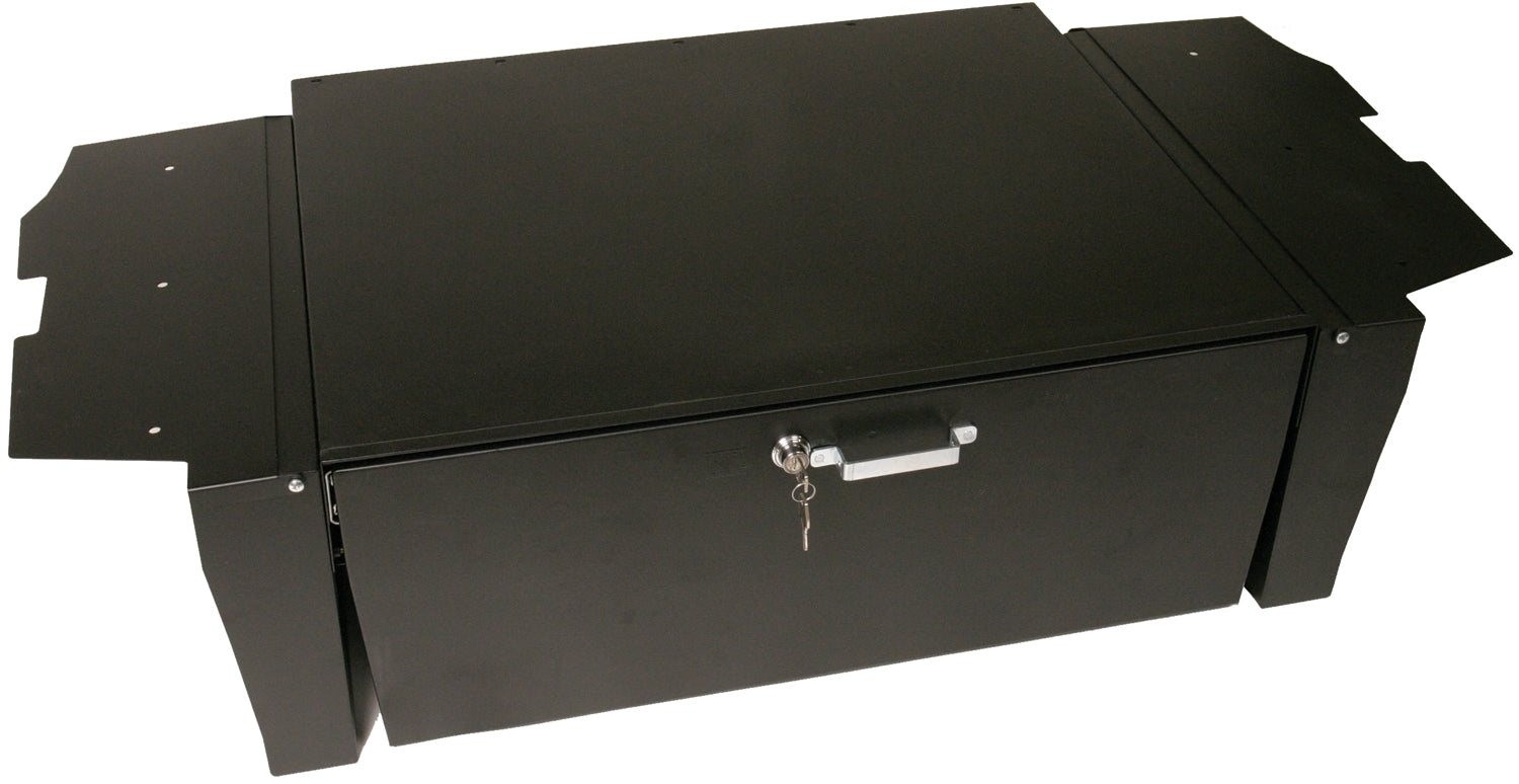 This heavy duty, high security, 16 gauge steel drawer mounts behind the rear seat in an FJ Cruiser. The large drawer slides on heavy duty roller bearings and can be securely locked. It provides protection for tools, gear, and other valuables. The drawer features an adjustable height mounting system which creates up to 4 inches of storage under the drawer. The side flaps open to access the jack, power outlets, and additional storage. A divider kit is available but sold separately, (Part number 141-07 shown in picture).