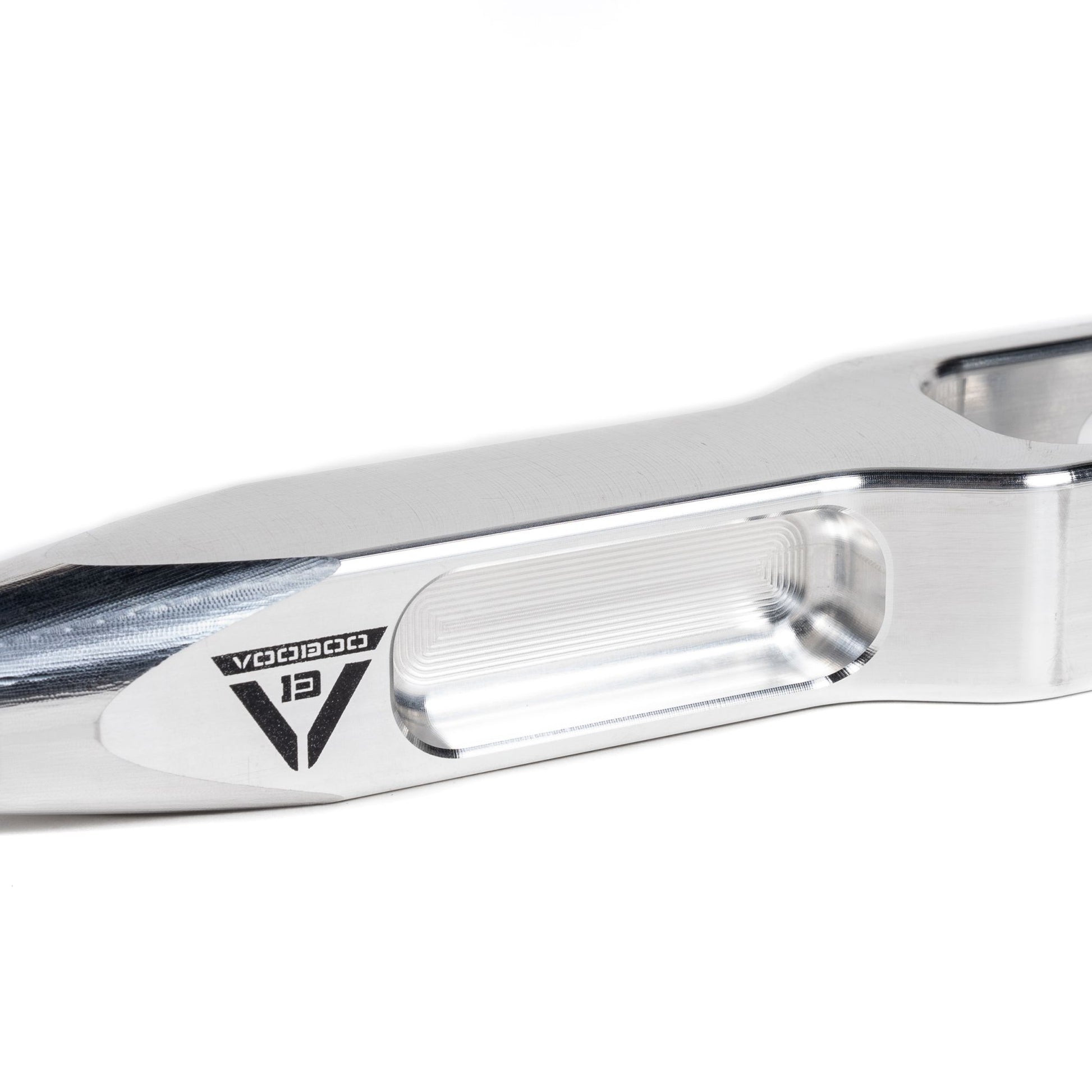 Voodoo13 Rear Camber Arms are precision CNC-machined from high strength 6061-T6 aluminum and coated in MIL-A-8625 Type III Hard Anodize. Hardened 4140 chromoly steel rod ends are black zinc coated for protection against the elements, and Grade 8 hardware is used to ensure they will withstand abuse from high performance street cars and track cars alike. Voodoo13 Rear Camber Arms are much lighter than OEM parts, and have increased strength and rigidity. Voodoo13 Rear Camber Arms offer a wide range of adjustability, to ensure that you can set your vehicle's suspension up to your desired settings, for street and track.