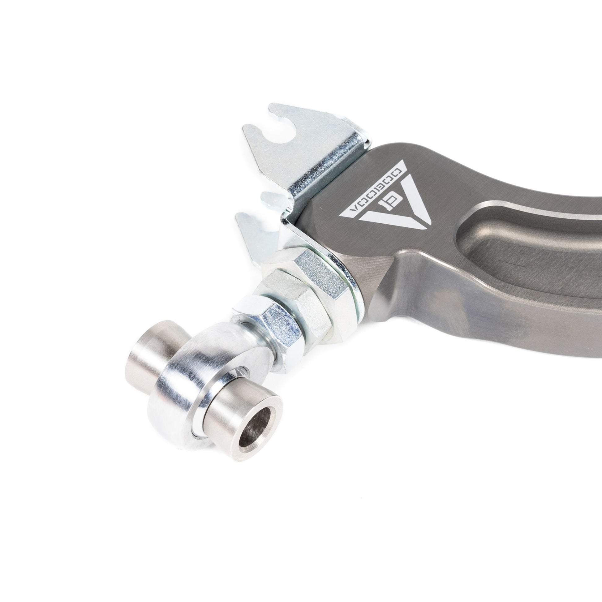 Voodoo13 Rear Camber Arms are precision CNC-machined from high strength 6061-T6 aluminum and coated in MIL-A-8625 Type III Hard Anodize. Hardened 4140 chromoly steel rod ends are black zinc coated for protection against the elements, and Grade 8 hardware is used to ensure they will withstand abuse from high performance street cars and track cars alike. Voodoo13 Rear Camber Arms are much lighter than OEM parts, and have increased strength and rigidity. Voodoo13 Rear Camber Arms offer a wide range of adjustability, to ensure that you can set your vehicle's suspension up to your desired settings, for street and track.
