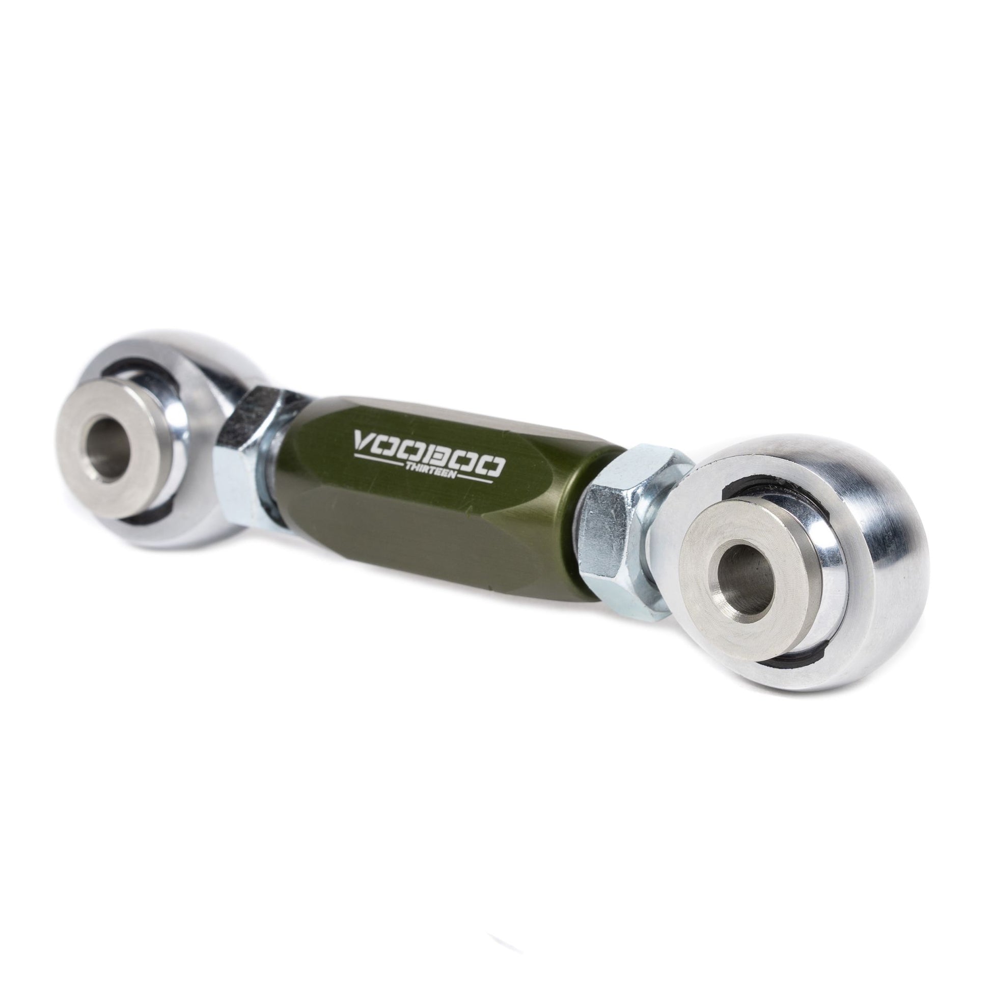 Voodoo13 adjustable rear Toe Arms give you the adjustability needed to get your toe back to spec after you've lowered your car. Voodoo13's suspension arms are engineered and designed for high performance street and race vehicles. They have been tested on race tracks across the globe, using feedback from top tier drivers and technical directors. Voodoo13 Toe Arms replace soft rubber OEM bushings with rigid spherical bearings, for increased handling and performance. However, they may sacrifice noise and comfort compared to arms that use rubber bushings. Our adjusting rod is made from 6061-T6 aluminum, which ensures our arms are incredibly strong and lightweight. MIL-A-8625 Type III Hard Anodize finish is available in multiple colors. CNC stainless steel spacers are machined in-house and work in conjunction with high quality made in the USA QA1 spherical rod ends.
