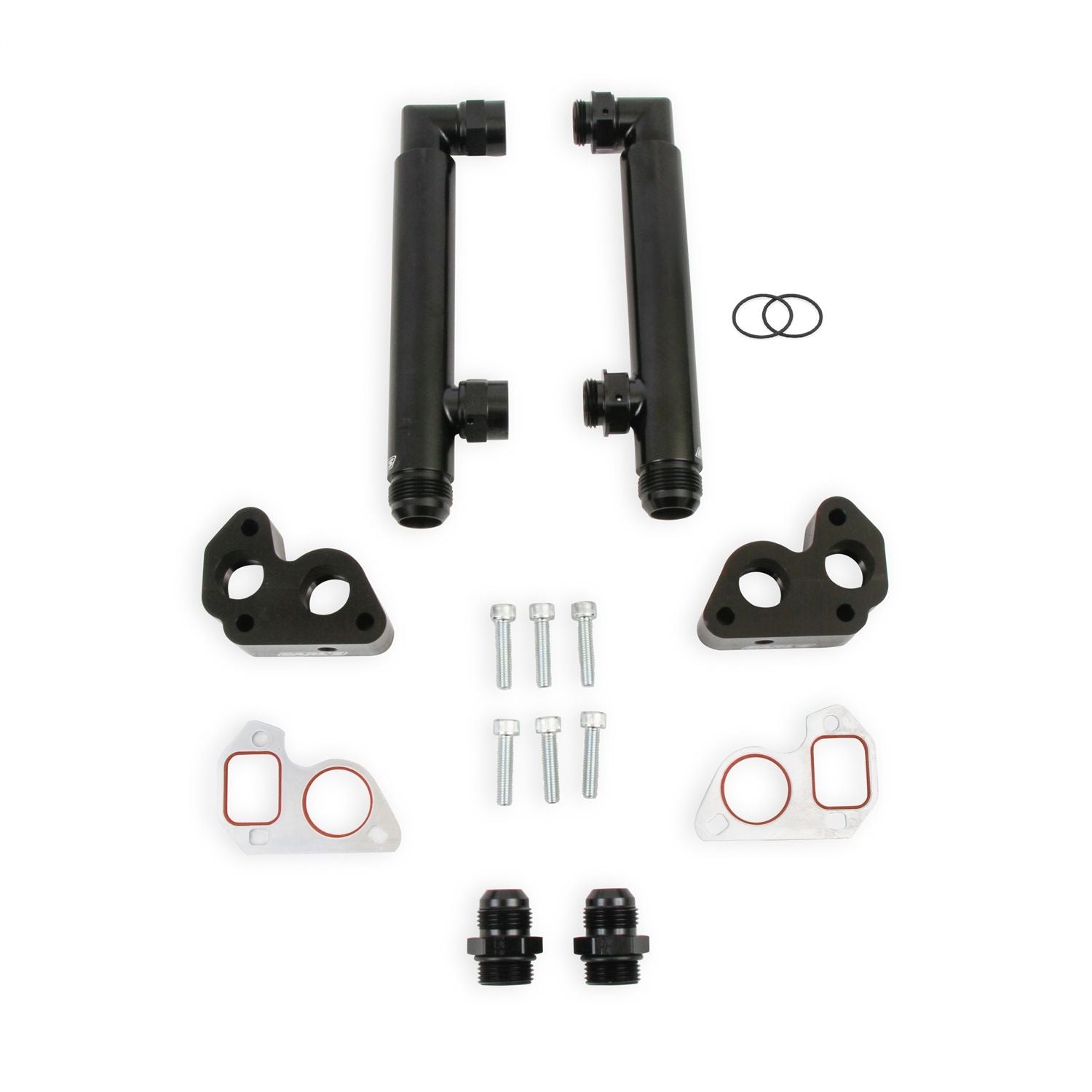 These new billet block adapters allow the use of a big block Chevy electric water pump on the GM LS engine. These adapters feature (2) -12 AN O-ring female outlet ports for routing coolant back to the radiator. The 1/8 in. NPT port on the sides of the adapters allow a convenient hook-up for the steam tube outlet (eliminates modification of the radiator or water pump when installing the steam tube plumbing). This part includes the two block adapters, gaskets and mounting bolts.
