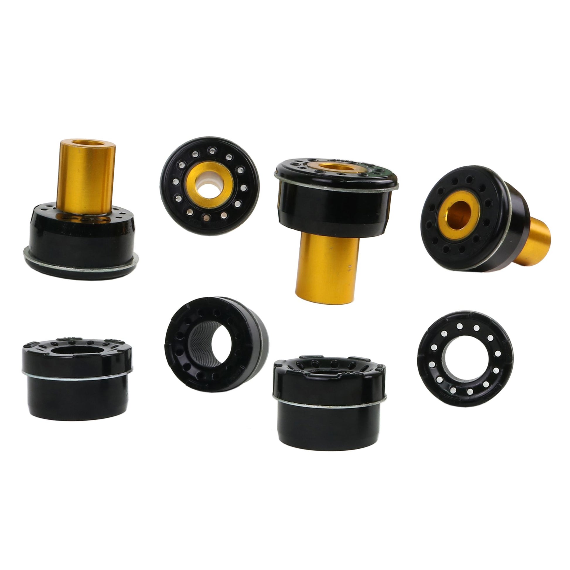 Subaru's rear subframe is mounted on rubber voided bushings which allows for a significant amount of compliance/movement in the frame during high cornering loads. Whiteline's low compliance polymer bushings eliminate this condition by positively locking in the frame position and removing the 'lateral walking' found when using high grip tires. The polymer bushing design has soft 'stand-off' buffers on the top and bottom surfaces of the bushing to allow slight vertical bushing movement of the subframe to eliminate that 'rock-solid' NVH feel and cushion against minor bumps and allow solid positive location when high torque and power is applied.