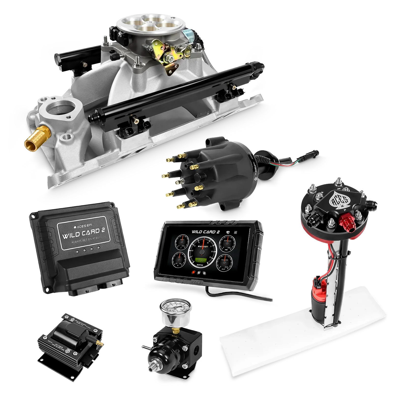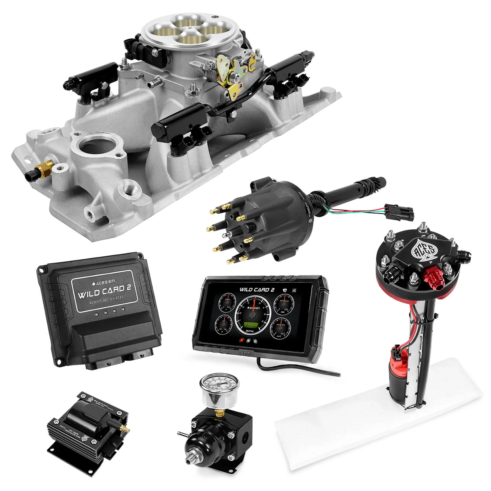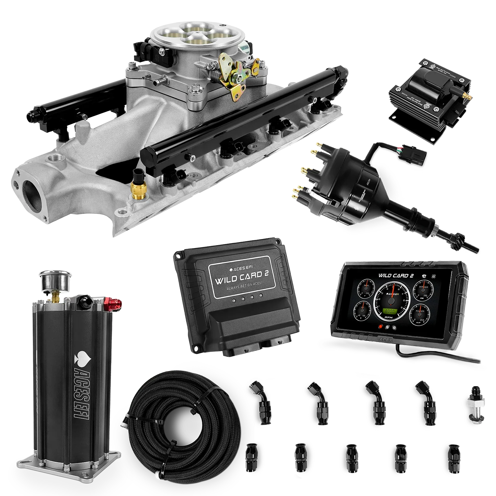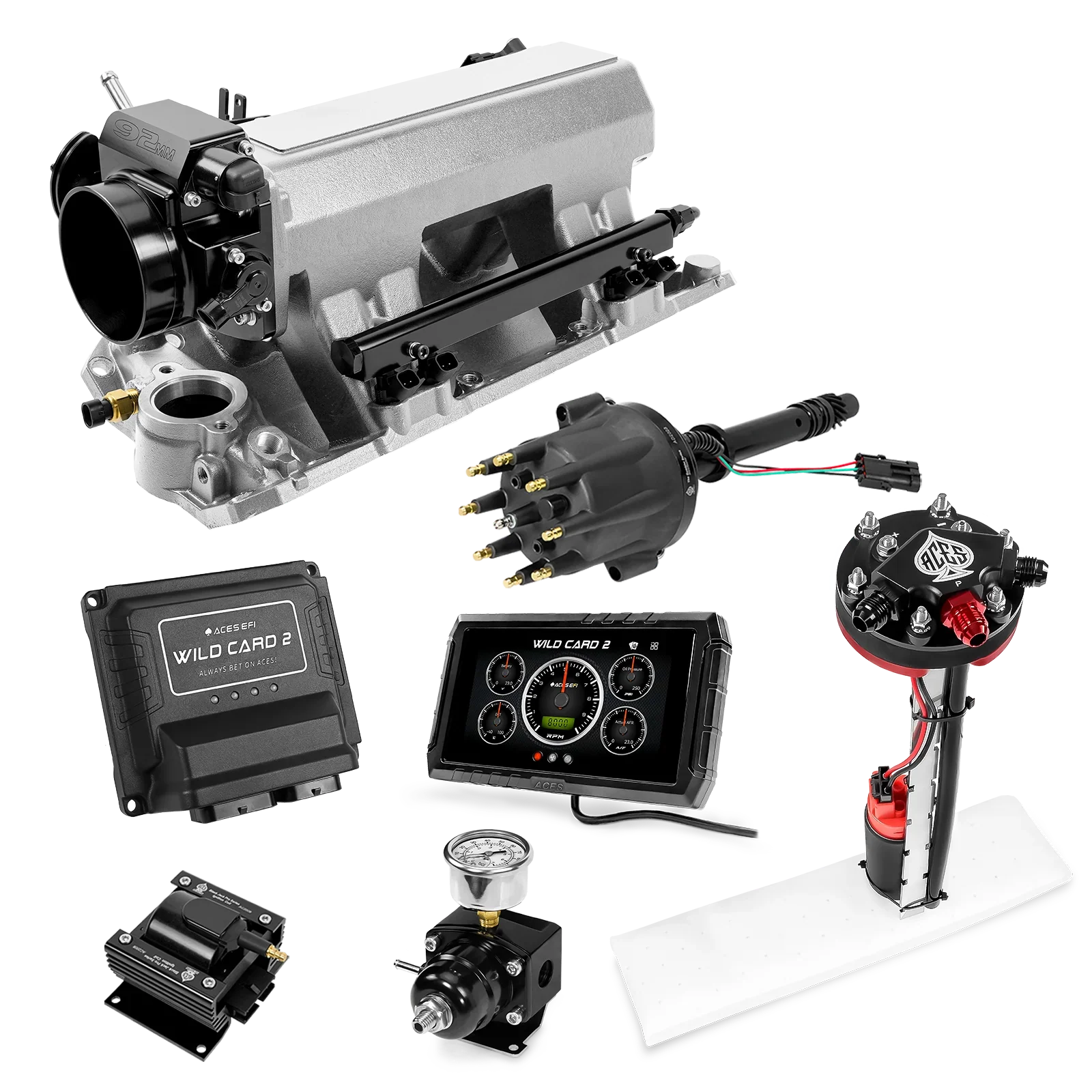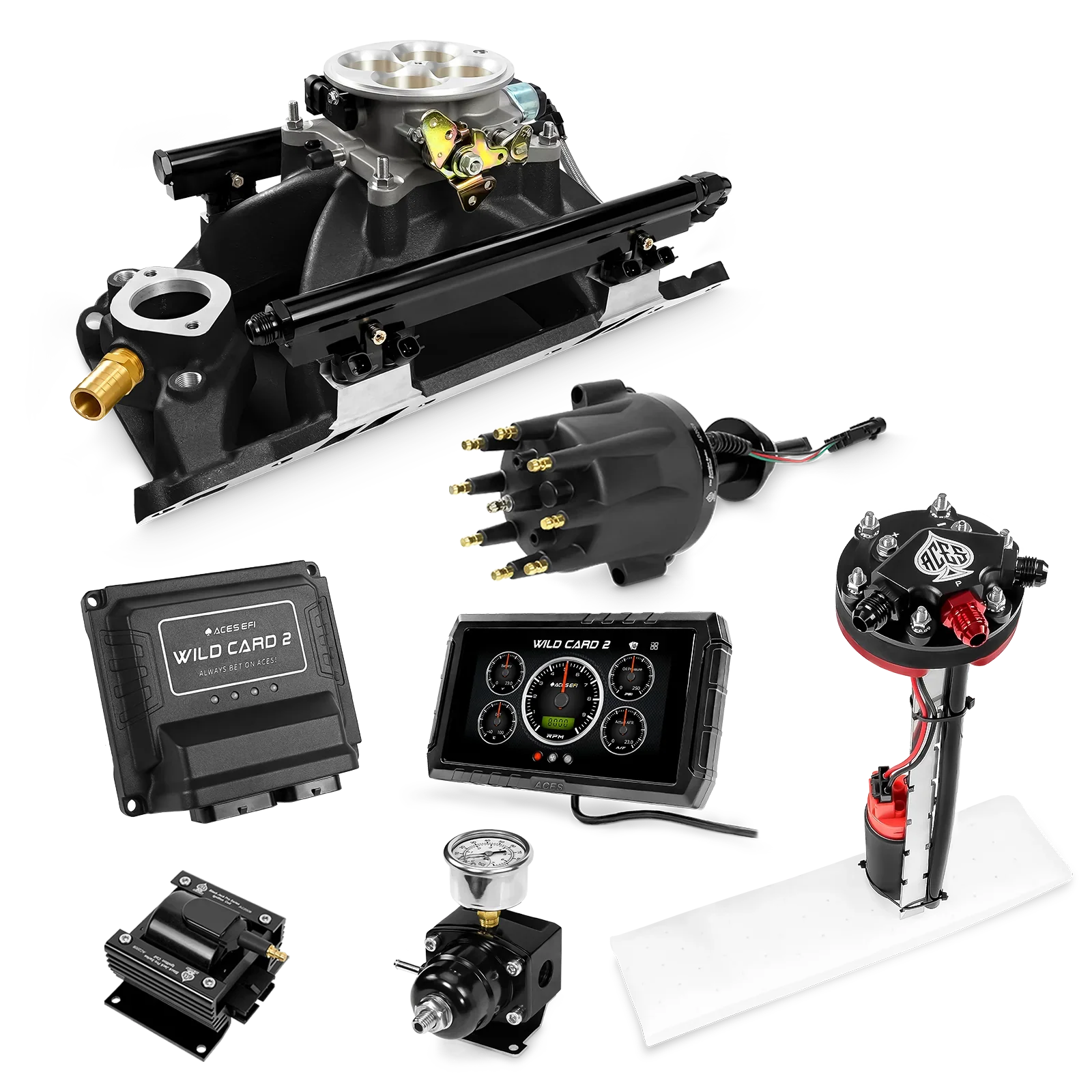 The Aces Wild Card 2 is a fully customizable, true Sequential Multi-Port EFI (MPEFI) system engineered for classic 8-cylinder engines. Unlike traditional TBI setups or aftermarket systems that use bank-to-bank injection, the Wild Card 2 delivers precise fuel metering to each cylinder, giving you superior throttle response, balanced fuel distribution, and more power across the RPM range.
