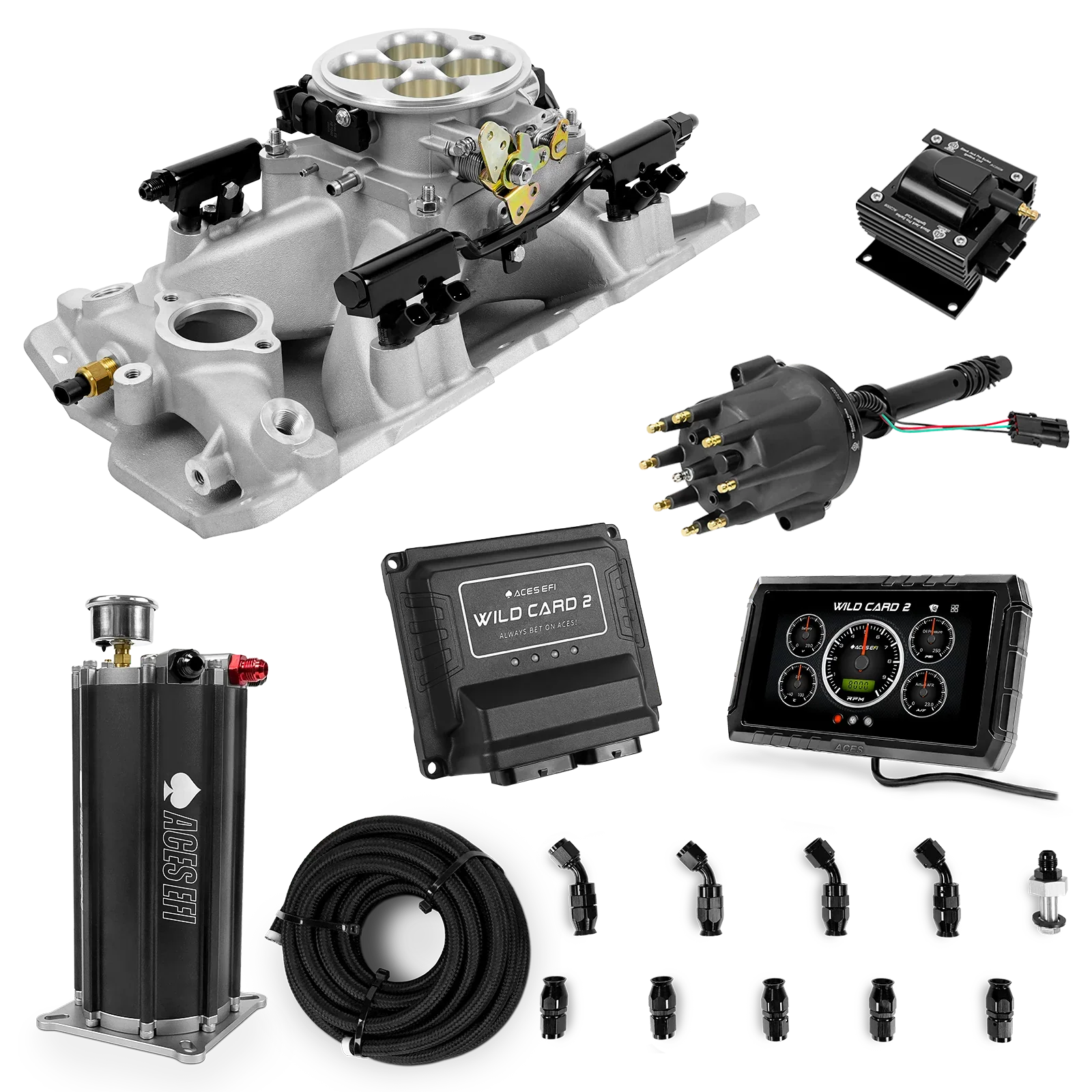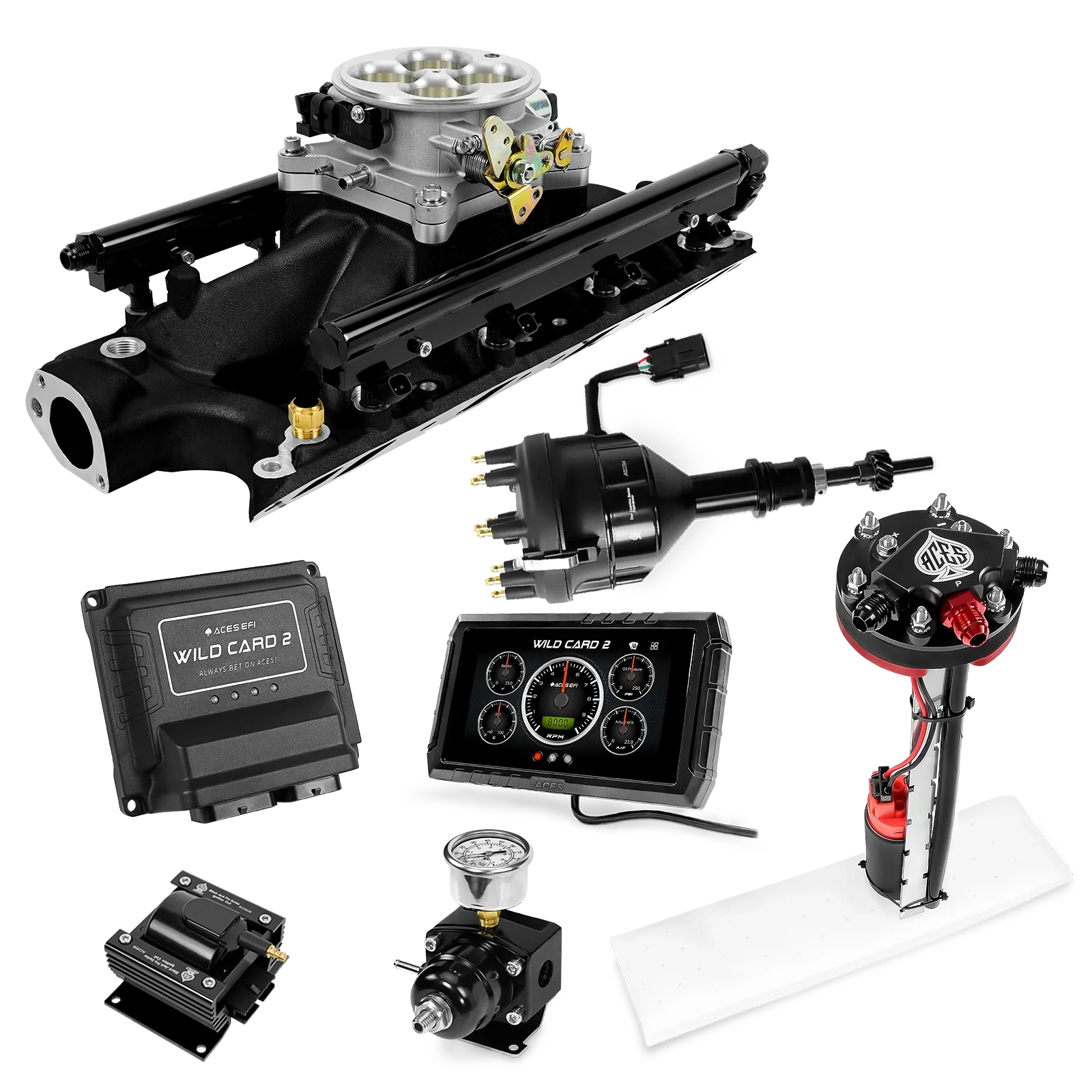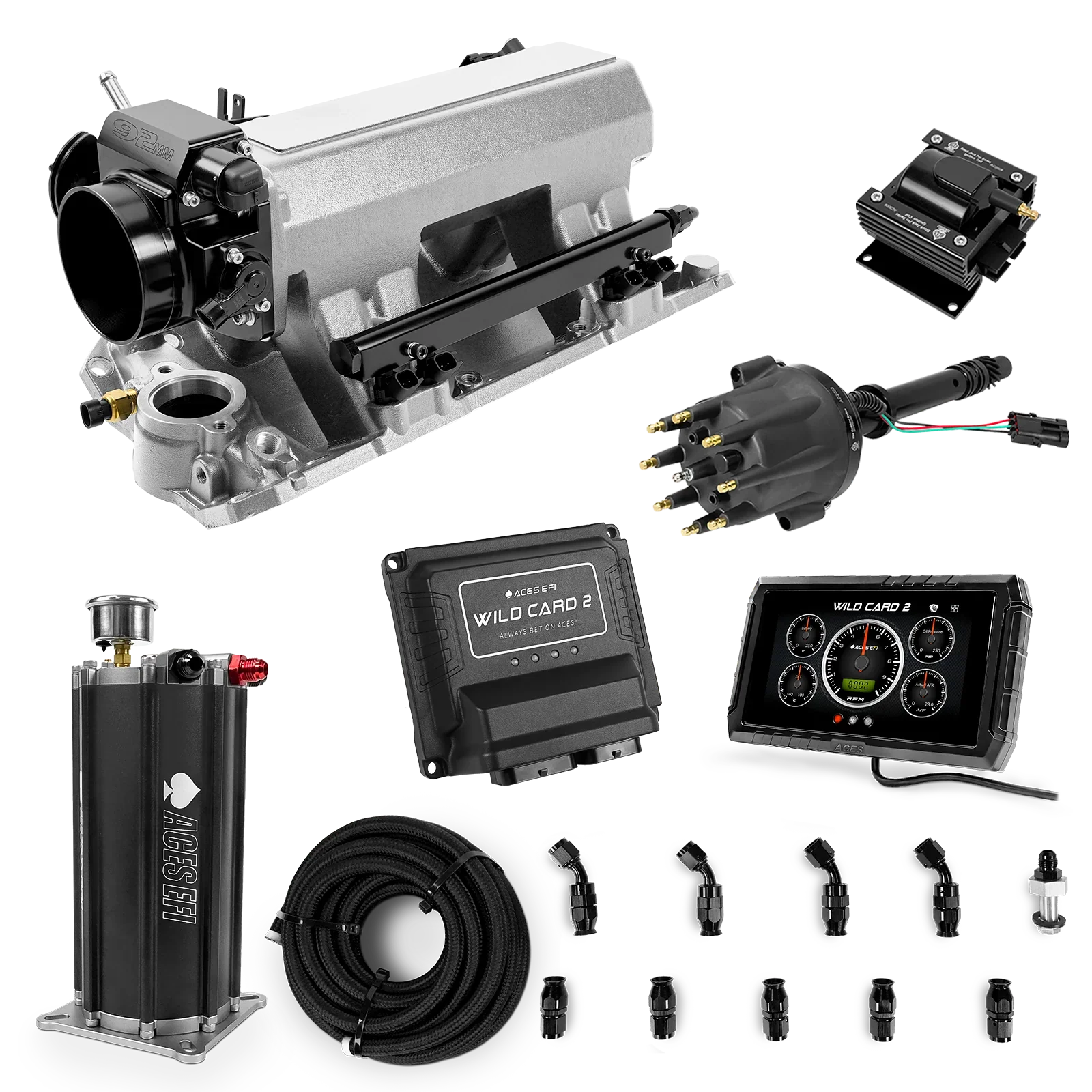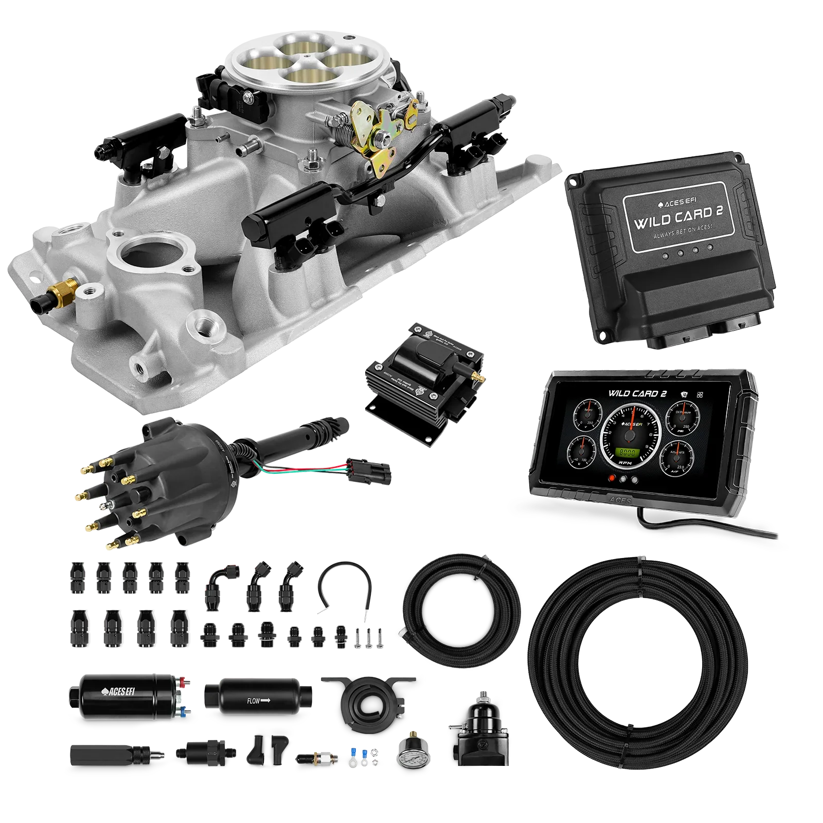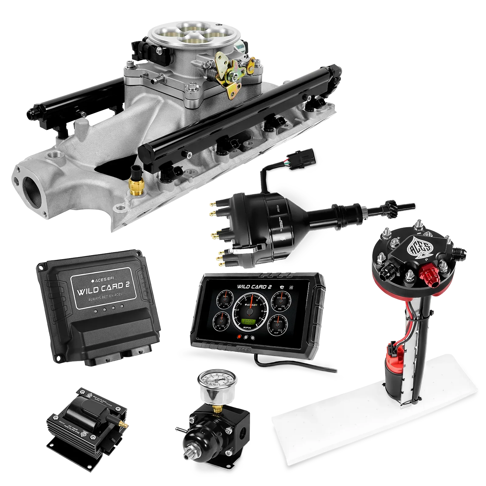 The Aces Wild Card 2 is a fully customizable, true Sequential Multi-Port EFI (MPEFI) system engineered for classic 8-cylinder engines. Unlike traditional TBI setups or aftermarket systems that use bank-to-bank injection, the Wild Card 2 delivers precise fuel metering to each cylinder, giving you superior throttle response, balanced fuel distribution, and more power across the RPM range.