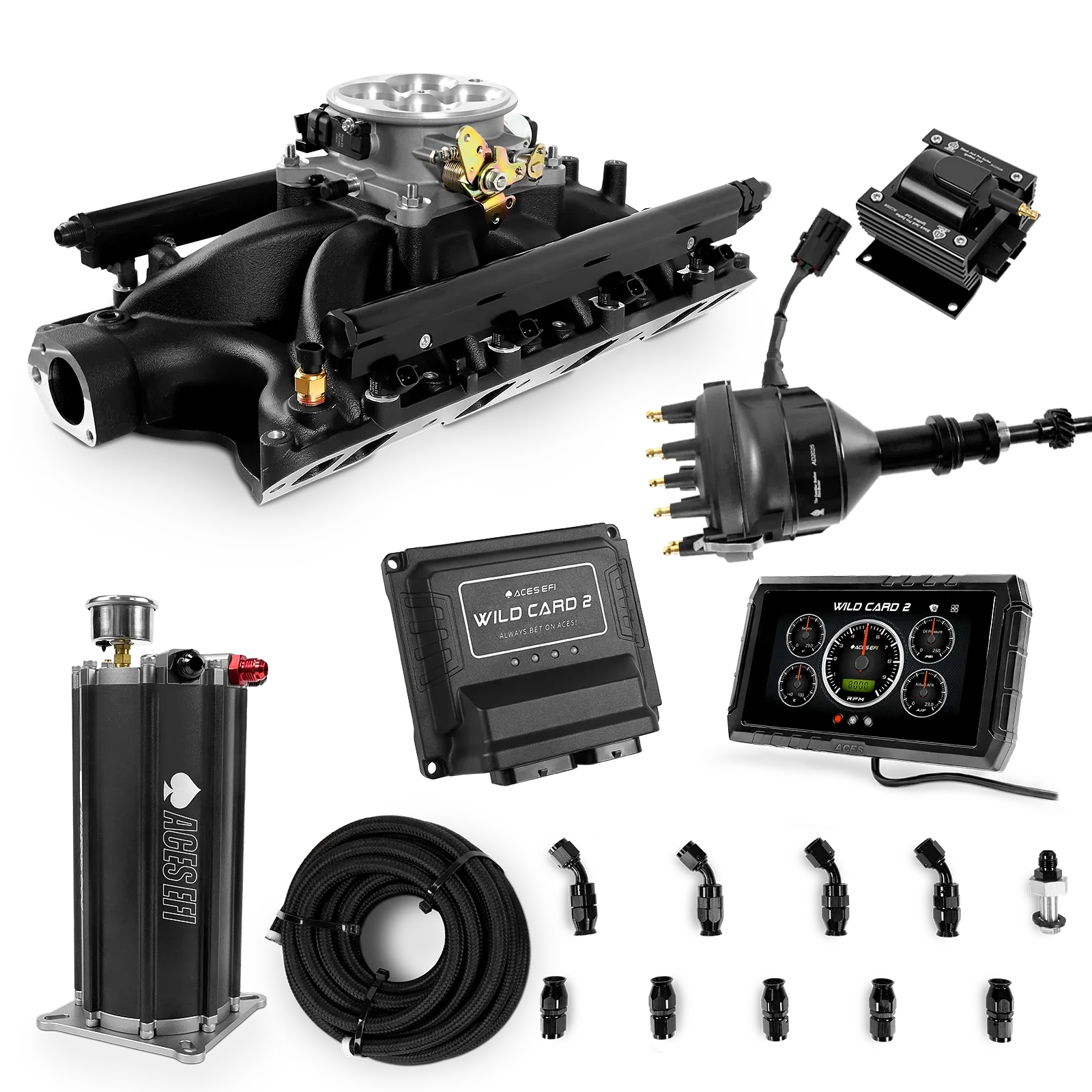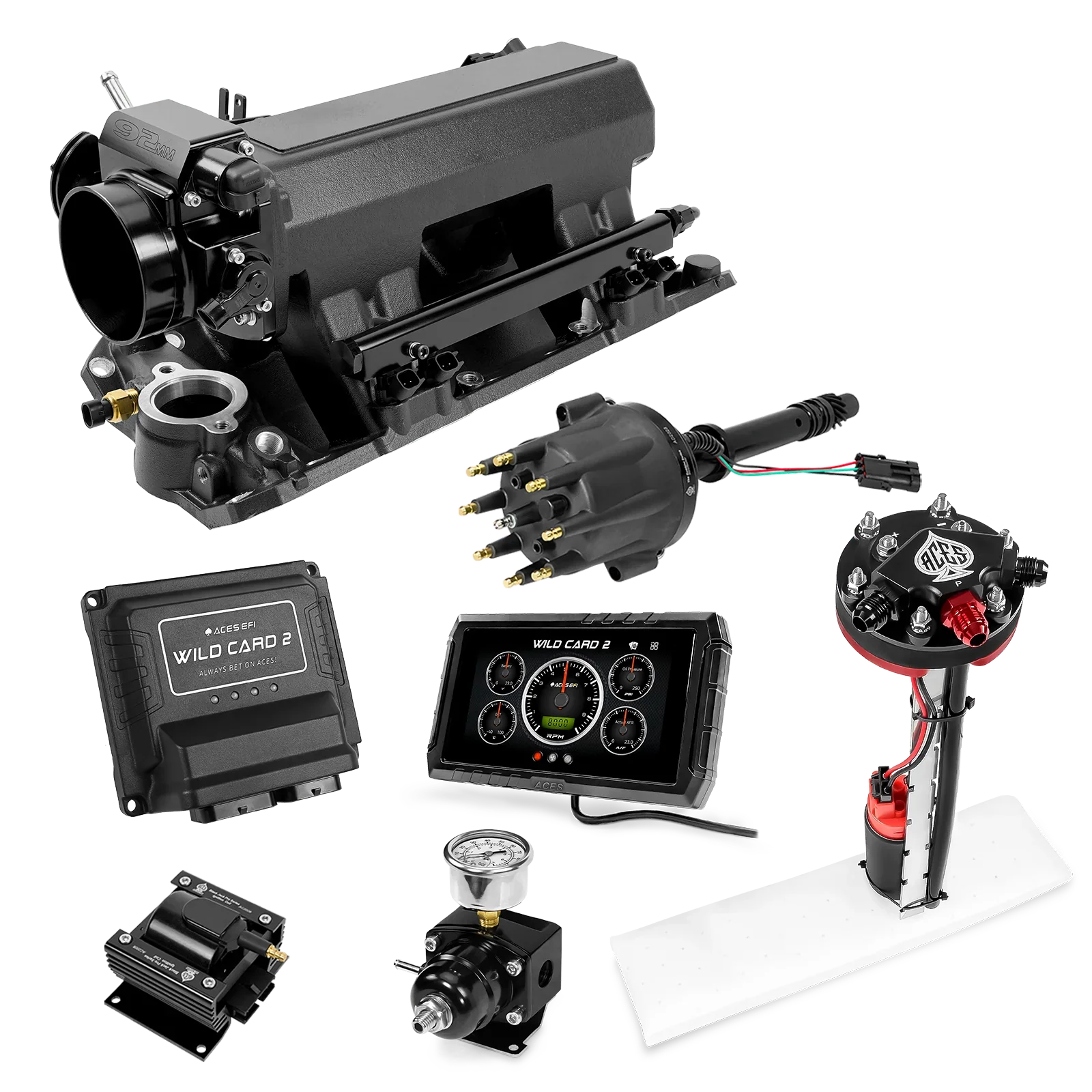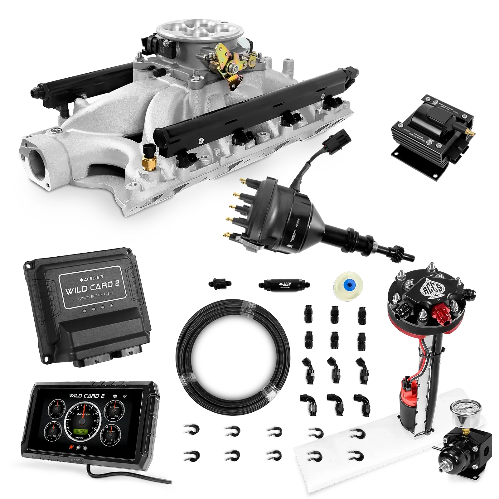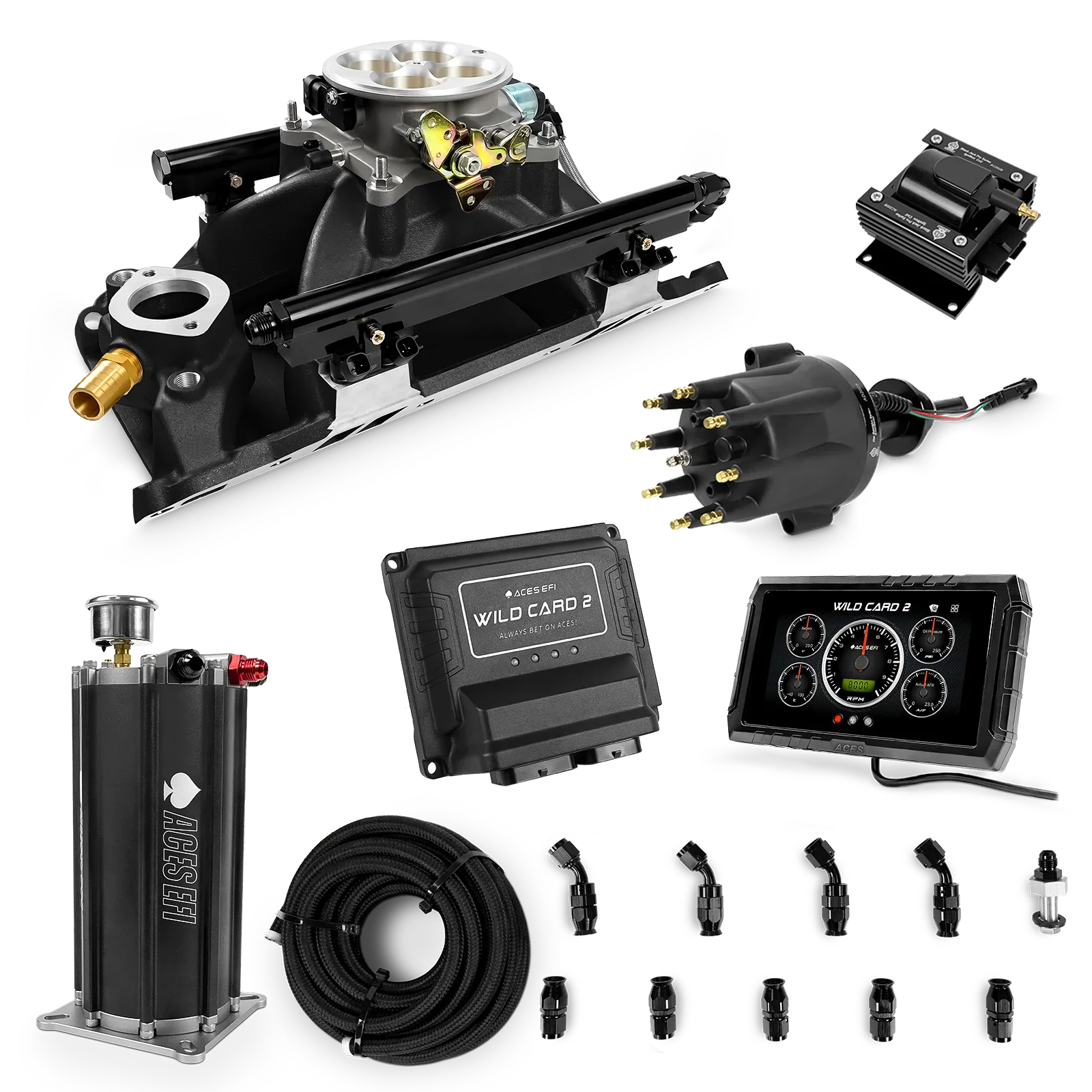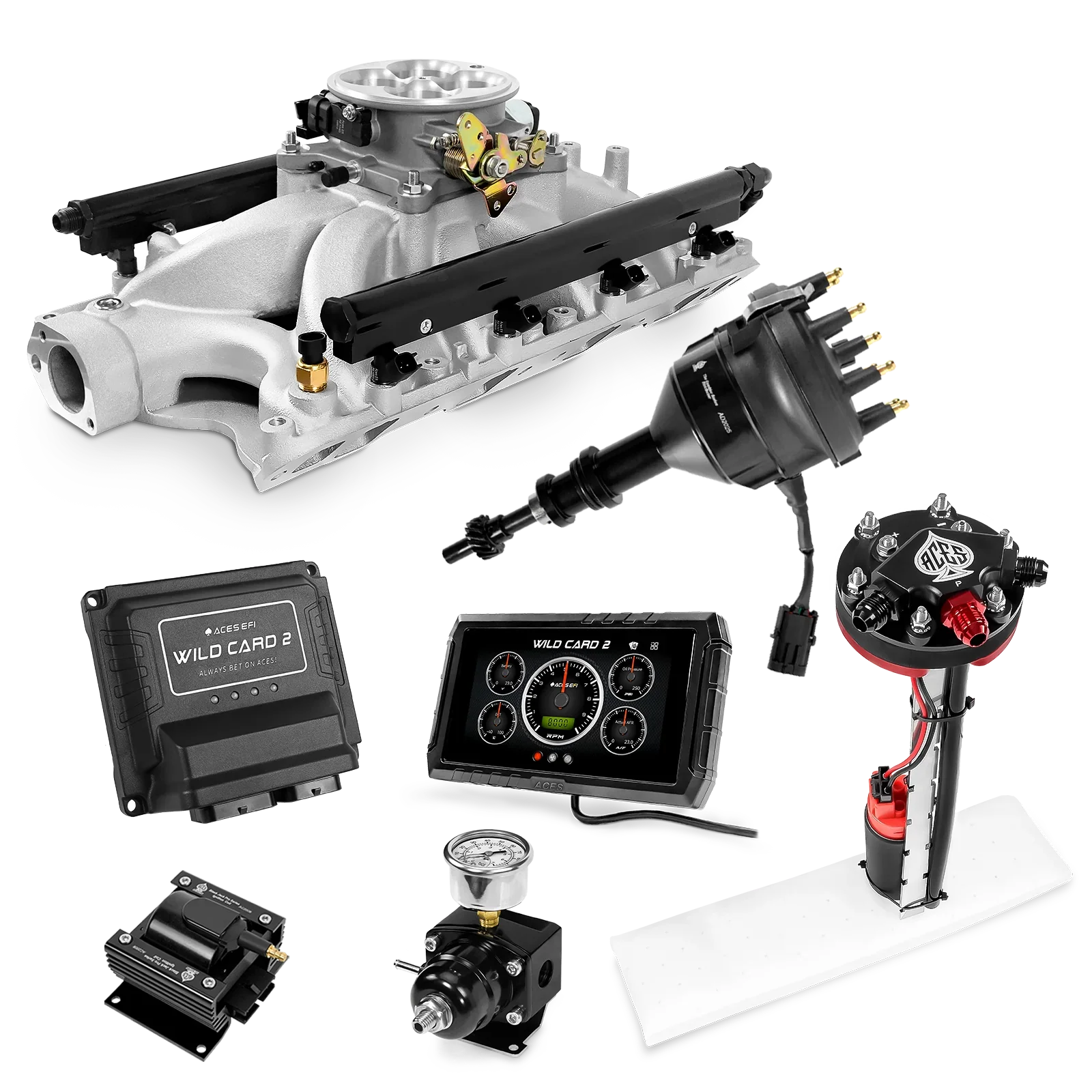 The Aces Wild Card 2 is a fully customizable, true Sequential Multi-Port EFI (MPEFI) system engineered for classic 8-cylinder engines. Unlike traditional TBI setups or aftermarket systems that use bank-to-bank injection, the Wild Card 2 delivers precise fuel metering to each cylinder, giving you superior throttle response, balanced fuel distribution, and more power across the RPM range.