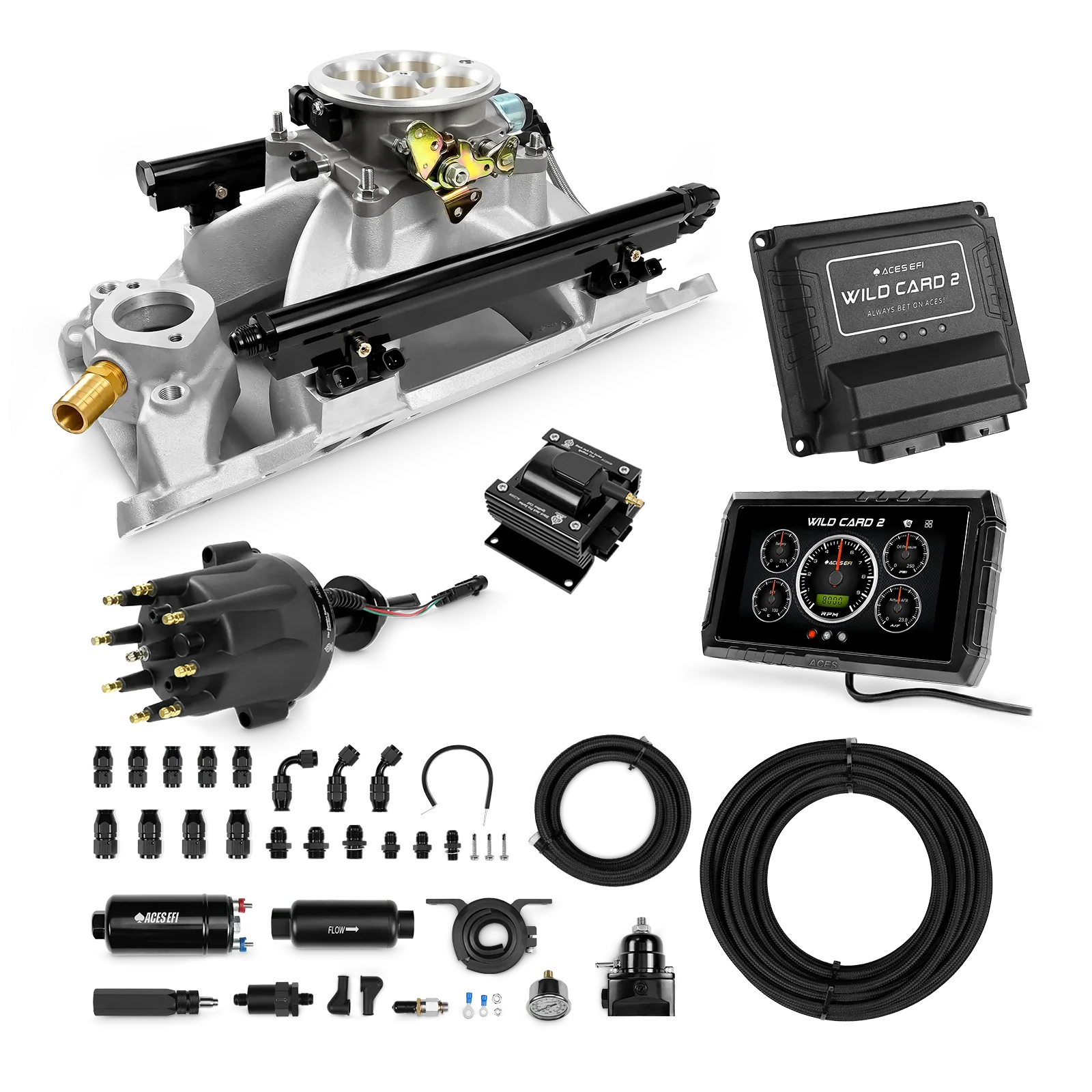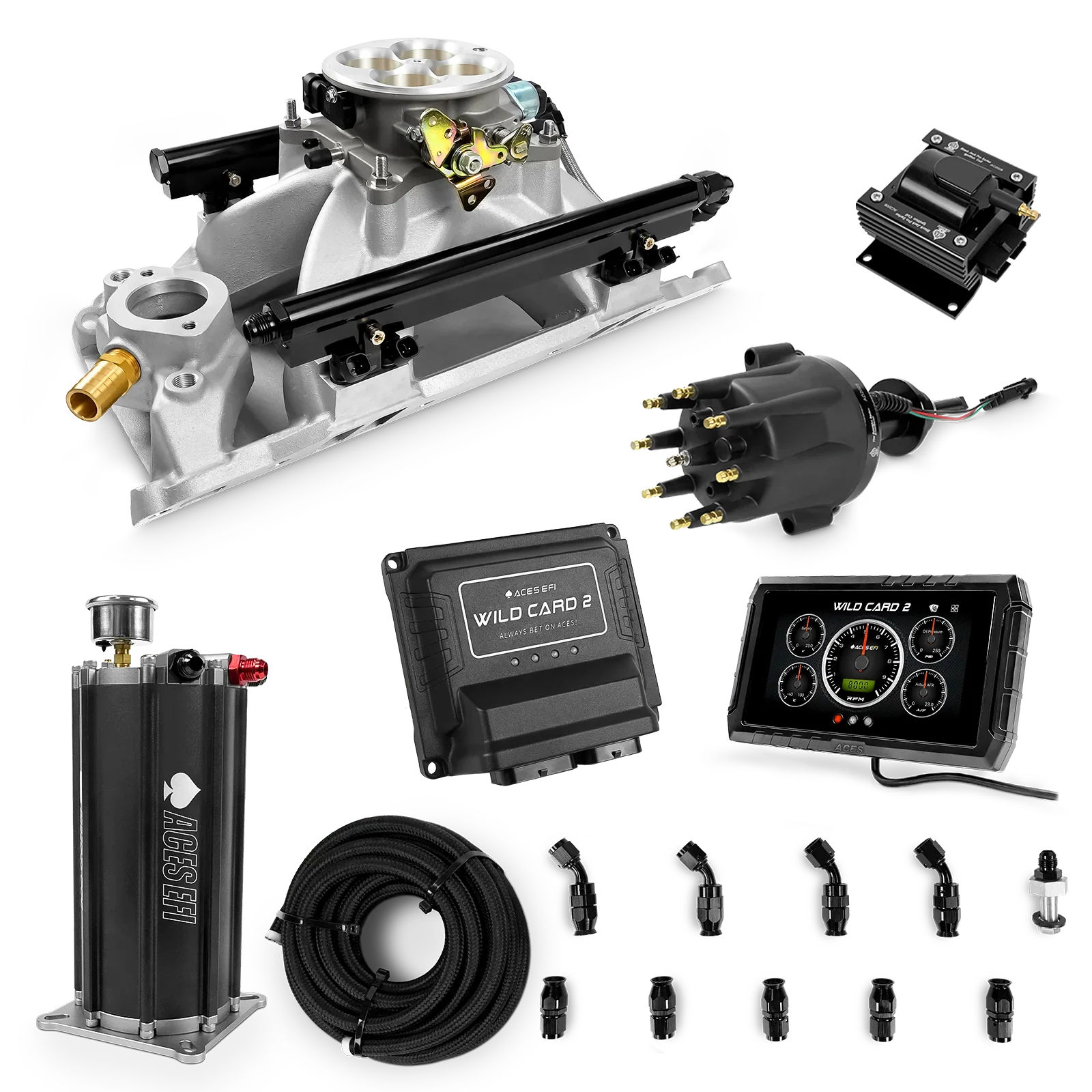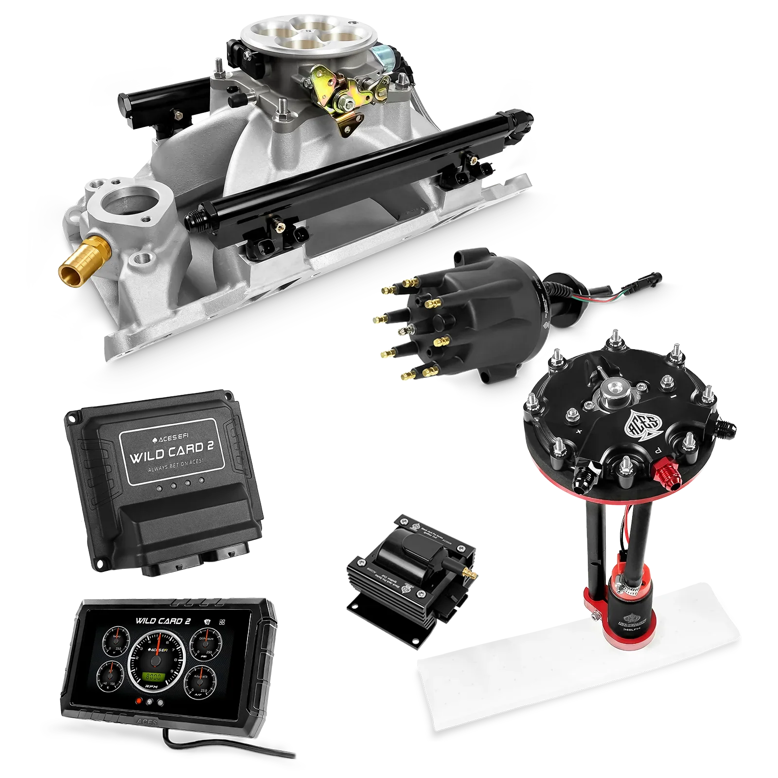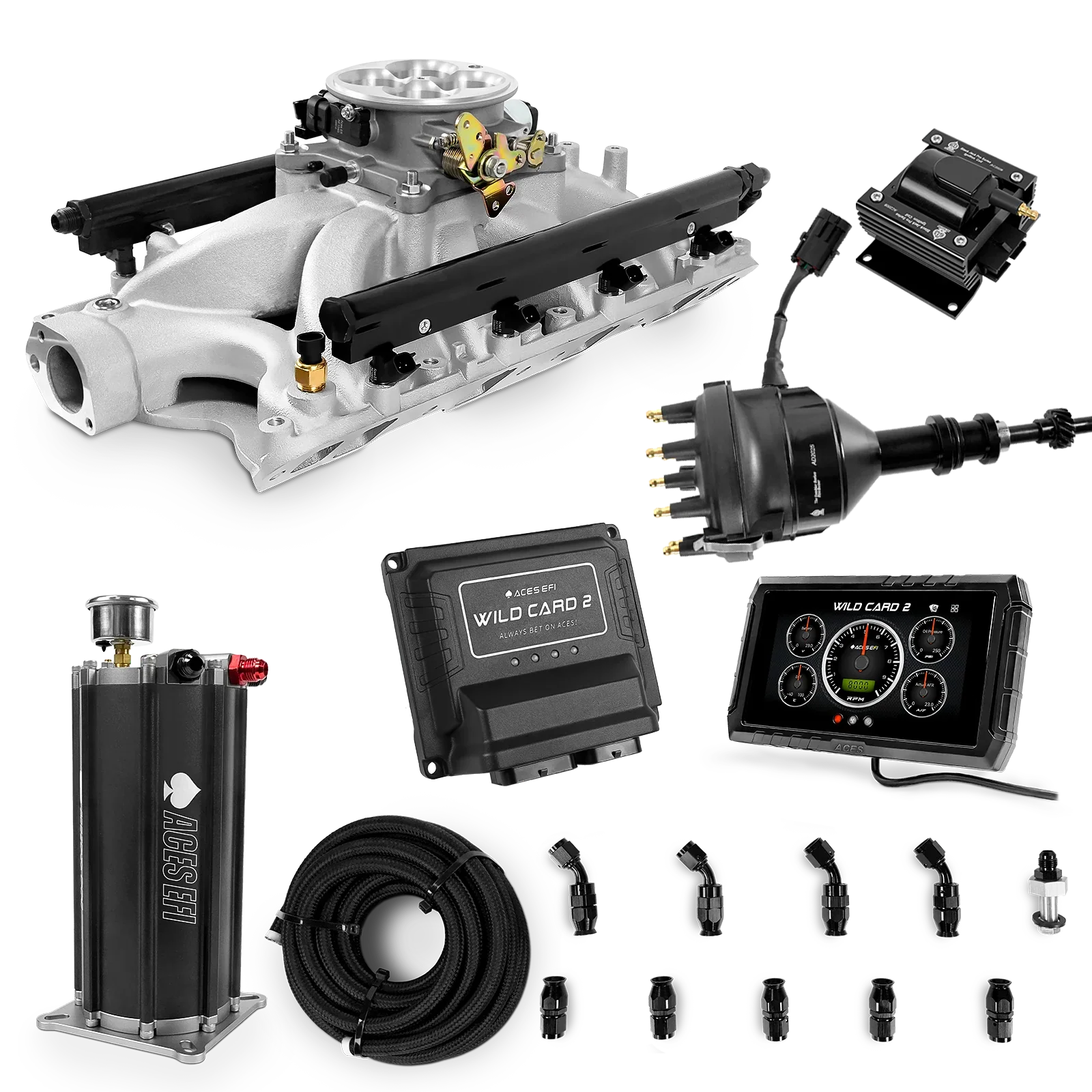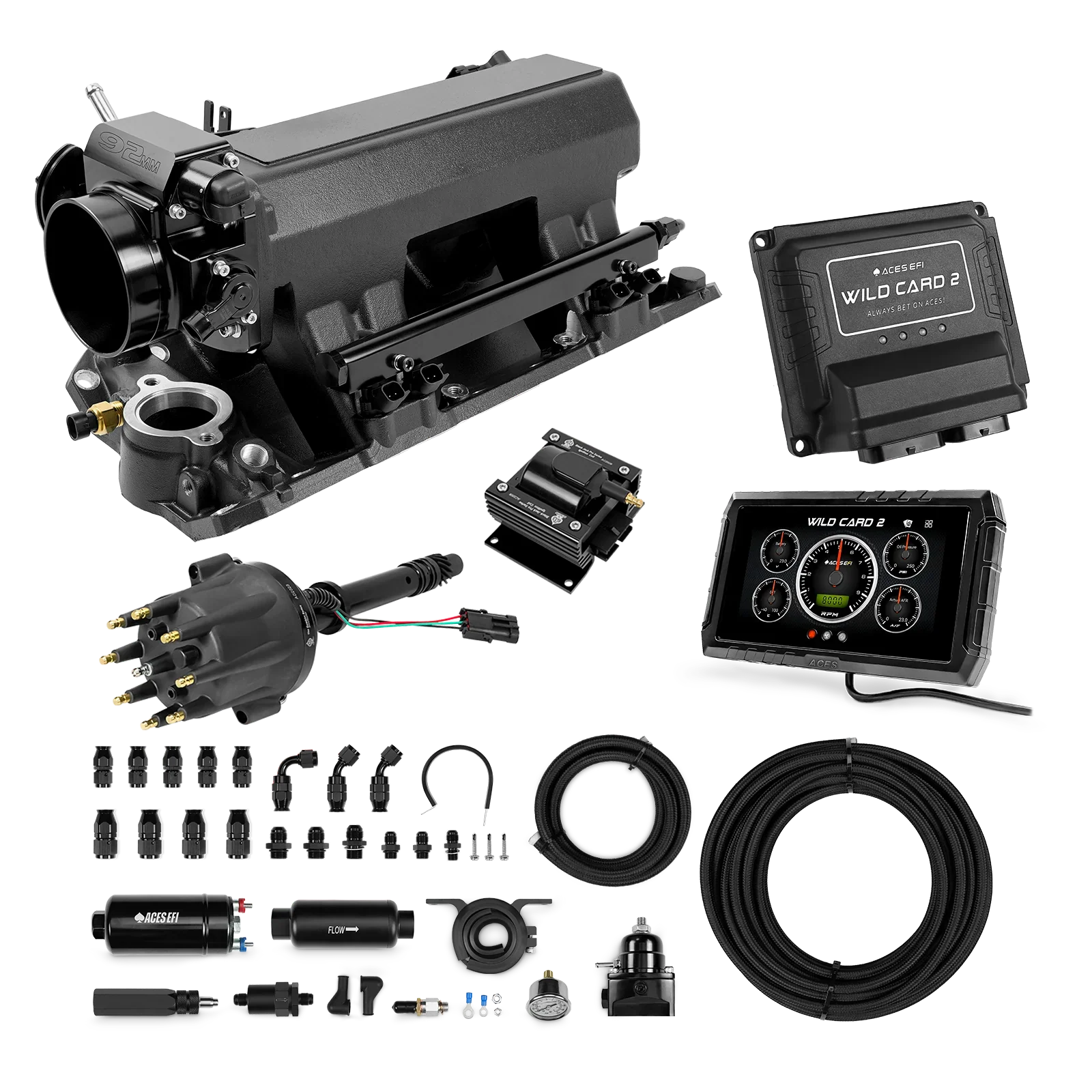 The Aces Wild Card 2 is a fully customizable, true Sequential Multi-Port EFI (MPEFI) system engineered for classic 8-cylinder engines. Unlike traditional TBI setups or aftermarket systems that use bank-to-bank injection, the Wild Card 2 delivers precise fuel metering to each cylinder, giving you superior throttle response, balanced fuel distribution, and more power across the RPM range.
