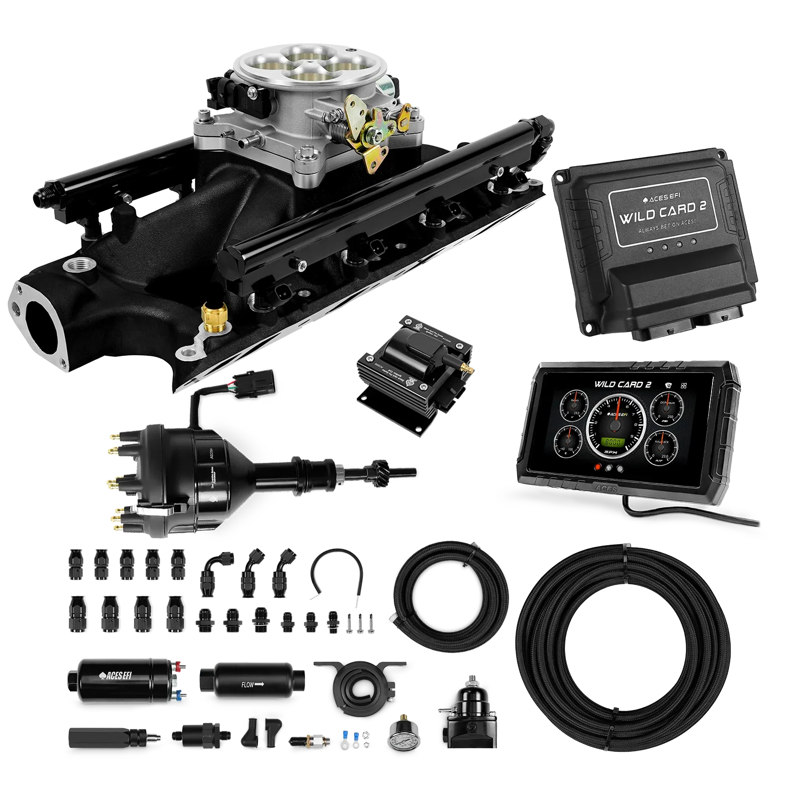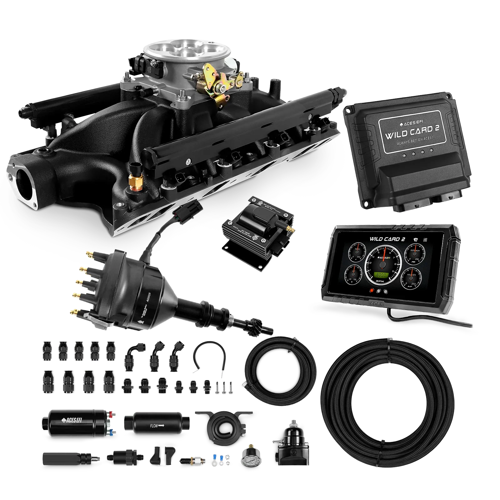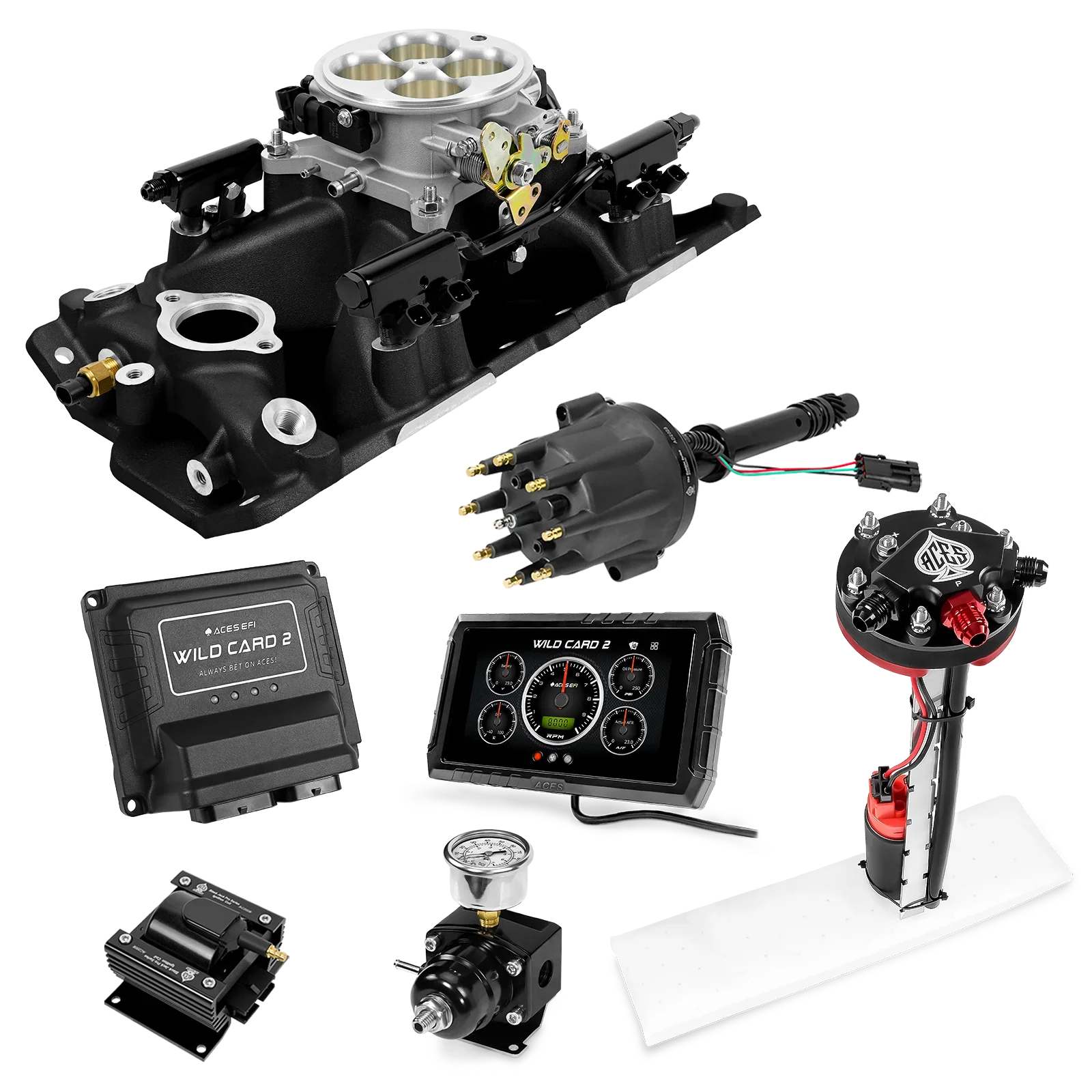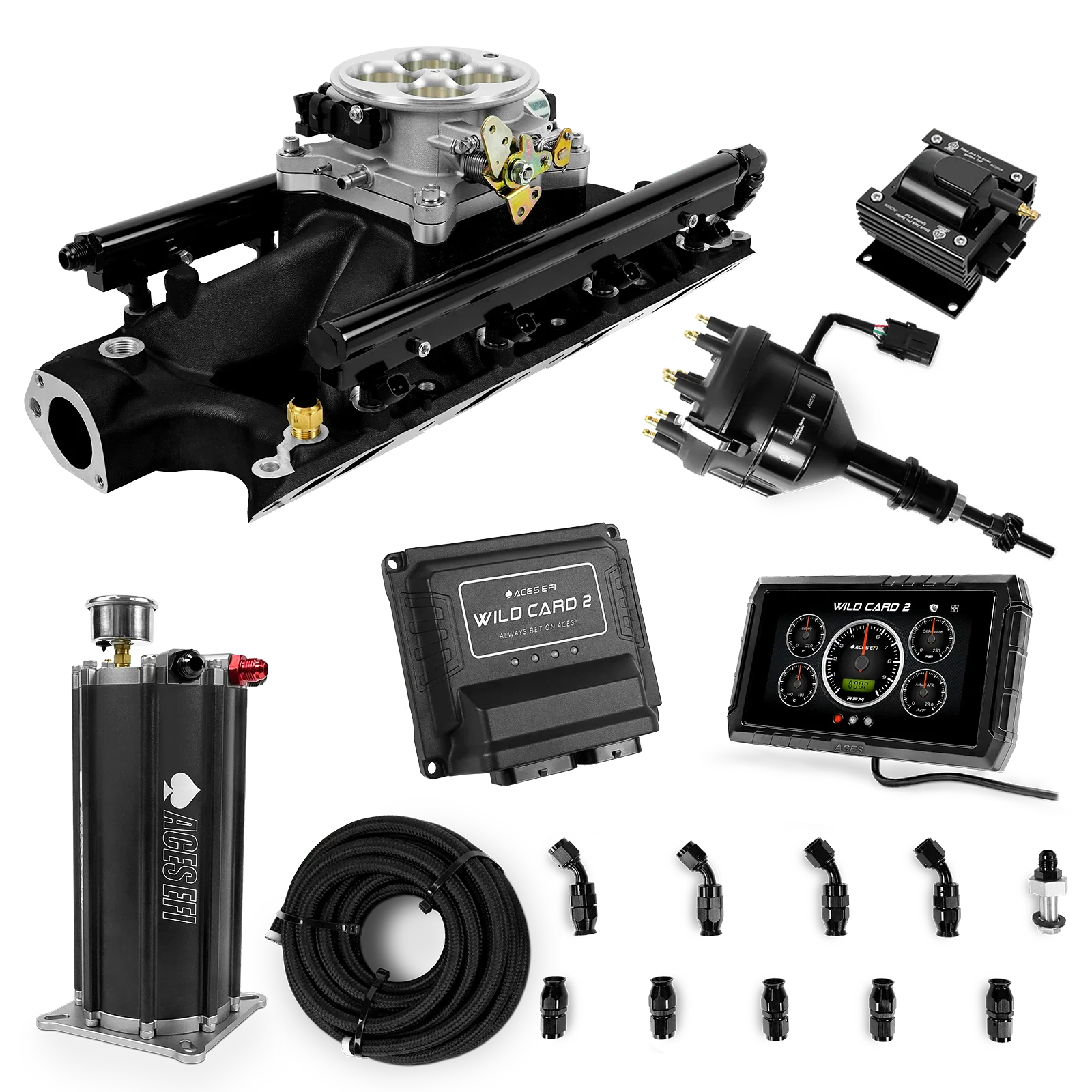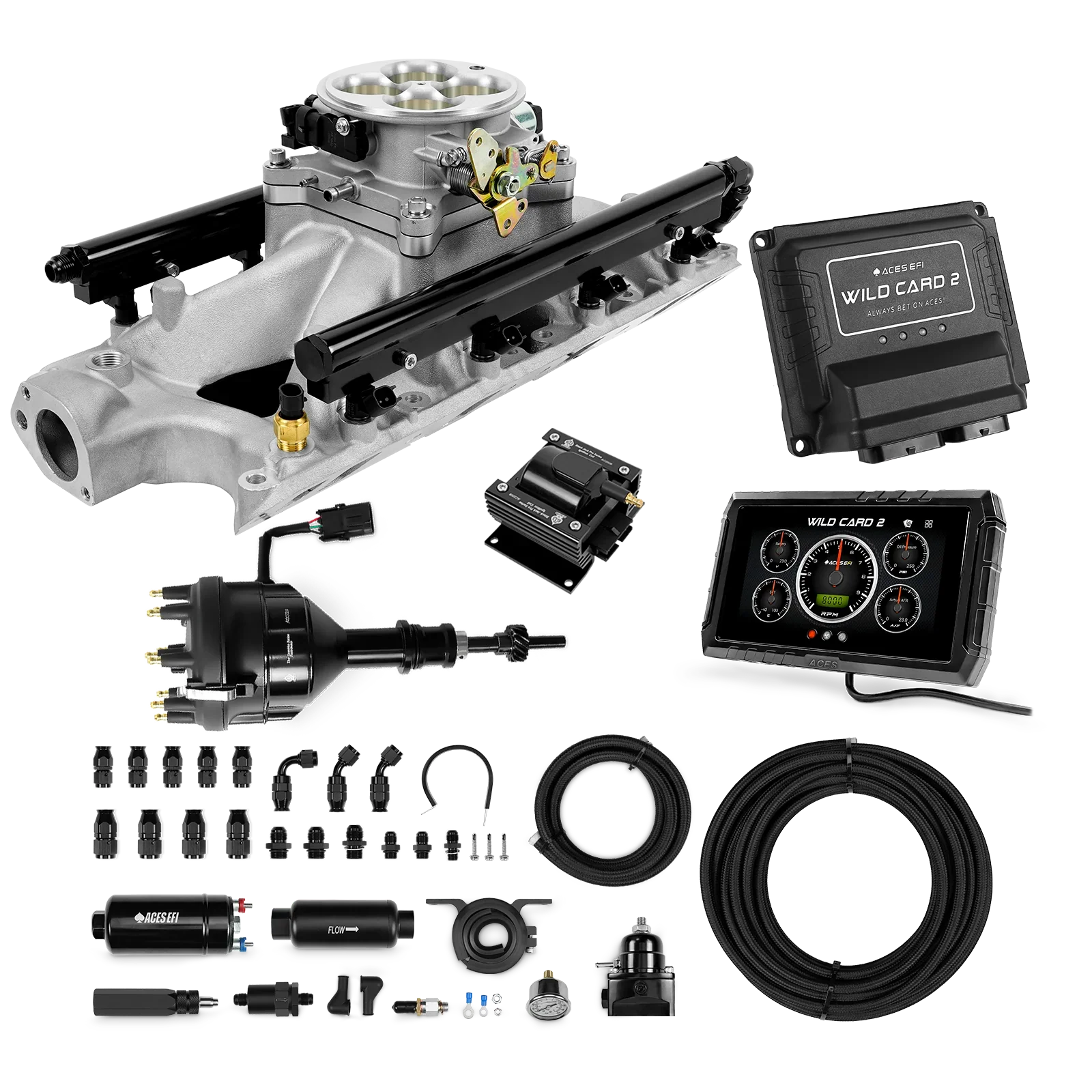 The Aces Wild Card 2 is a fully customizable, true Sequential Multi-Port EFI (MPEFI) system engineered for classic 8-cylinder engines. Unlike traditional TBI setups or aftermarket systems that use bank-to-bank injection, the Wild Card 2 delivers precise fuel metering to each cylinder, giving you superior throttle response, balanced fuel distribution, and more power across the RPM range.