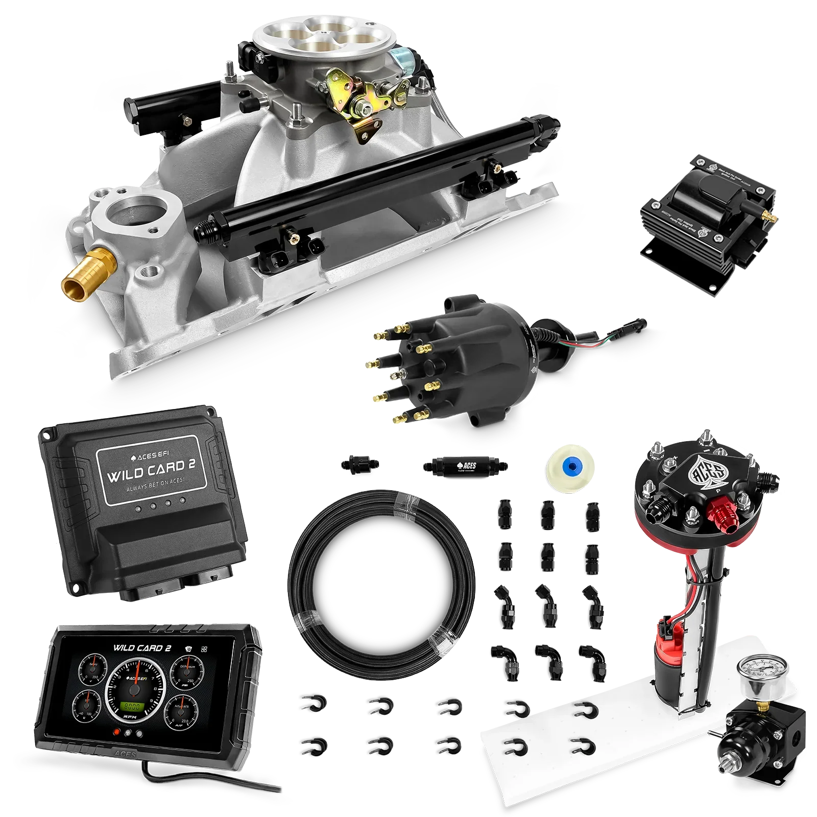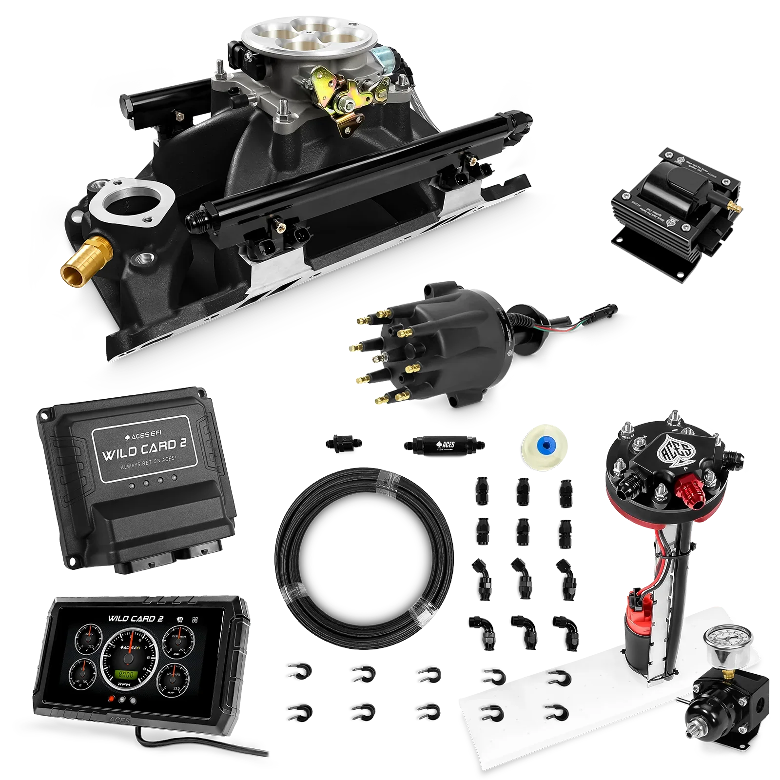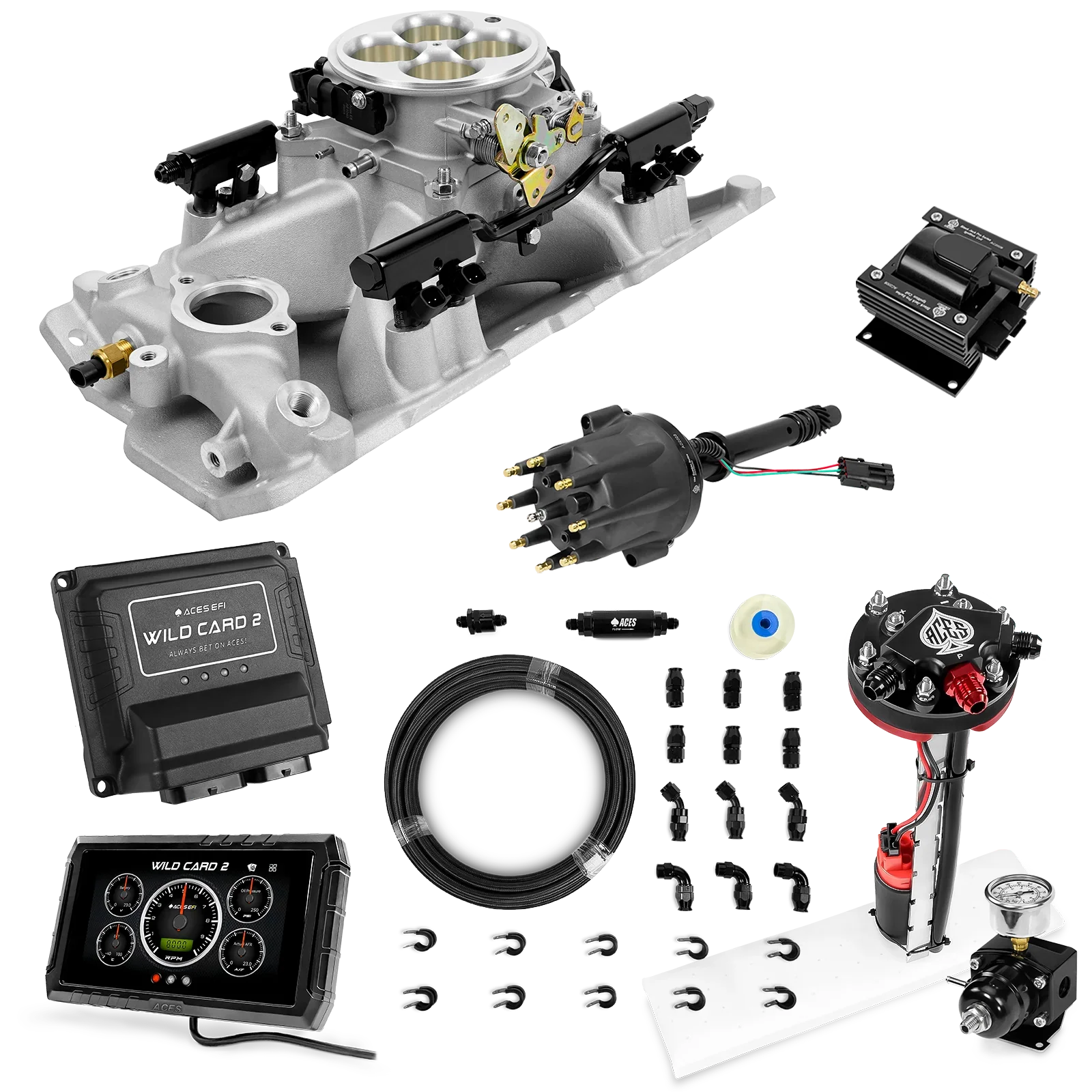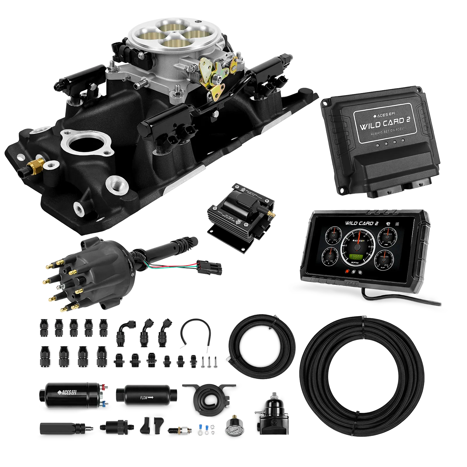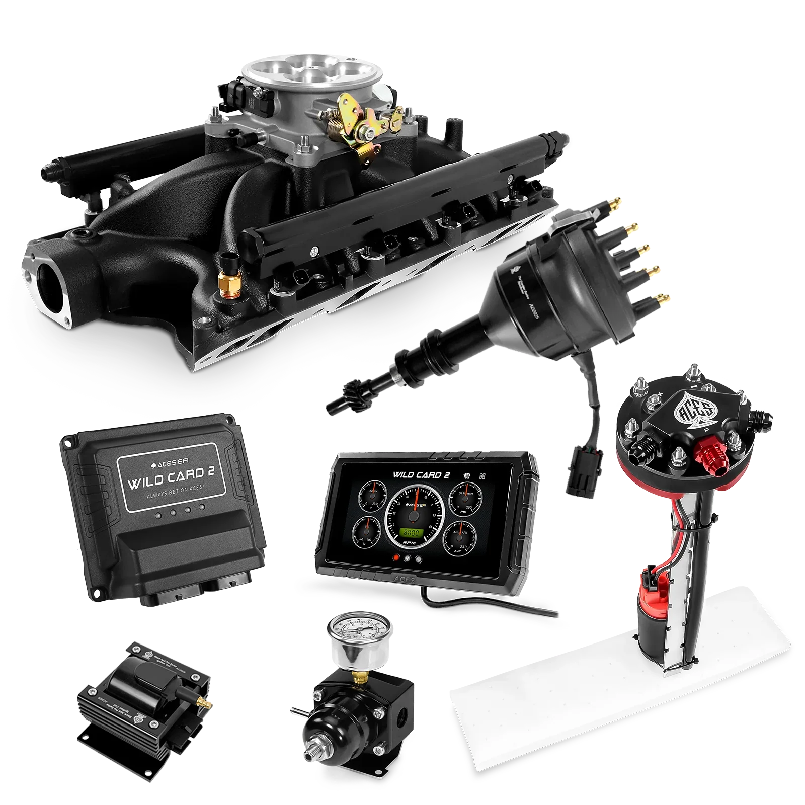 The Aces Wild Card 2 is a fully customizable, true Sequential Multi-Port EFI (MPEFI) system engineered for classic 8-cylinder engines. Unlike traditional TBI setups or aftermarket systems that use bank-to-bank injection, the Wild Card 2 delivers precise fuel metering to each cylinder, giving you superior throttle response, balanced fuel distribution, and more power across the RPM range.