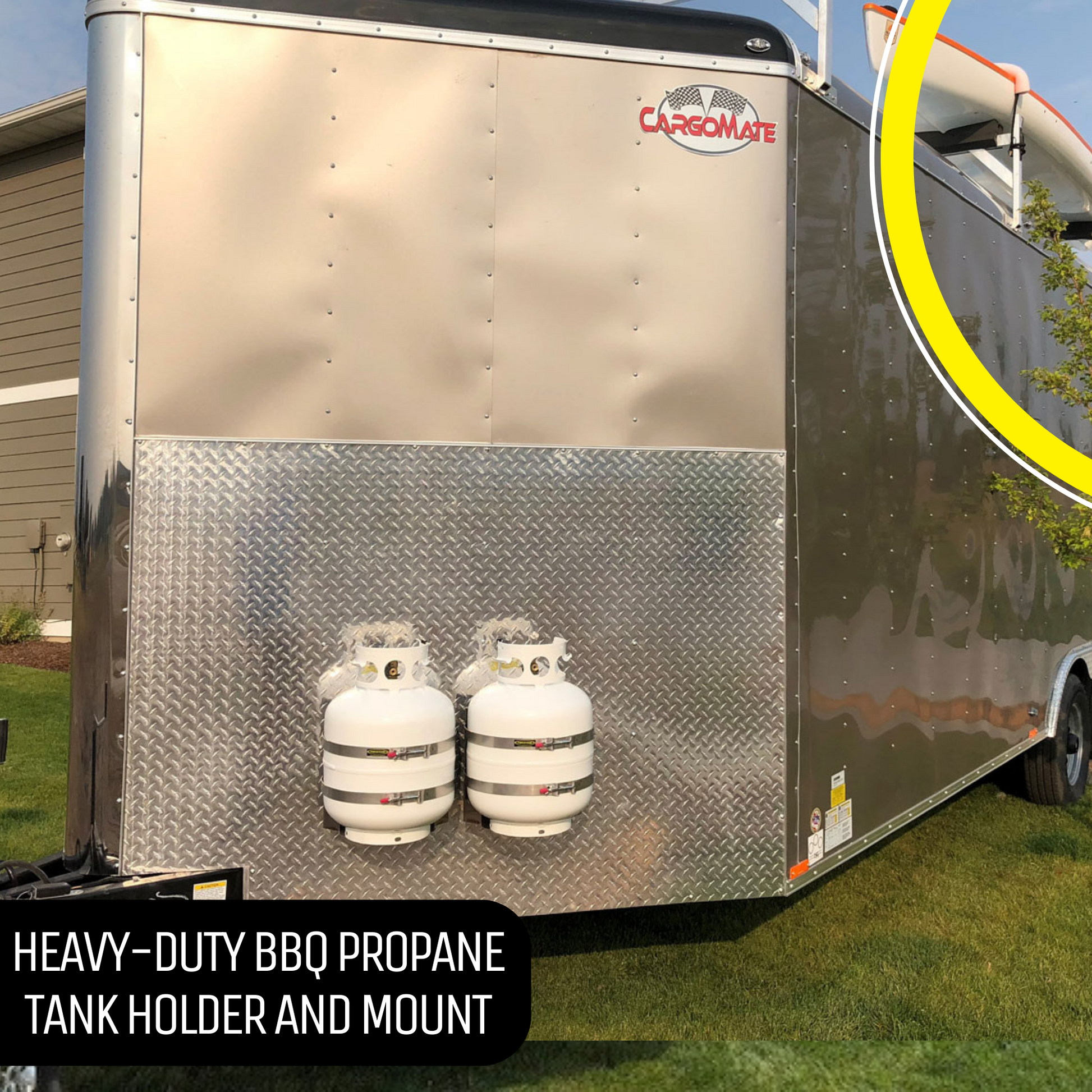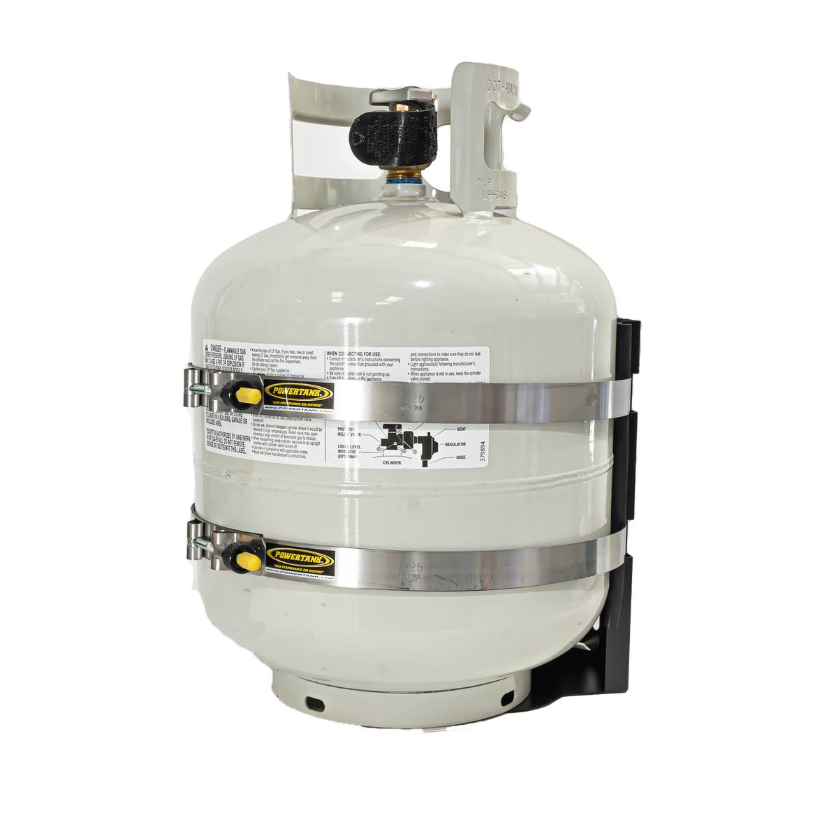 Mounting Bracket for 20 lb. BBQ Propane Tank from Power Tank. This mounting bracket is the best way to carry 20 lb. Propane Cylinders on your RV, trailer, or boat. It features a marine-grade frame, strap, and rivets with rubber trim which will not corrode, even when exposed to salt water. The two straps hold the tank securely over rough, washboard roads or choppy sea water.